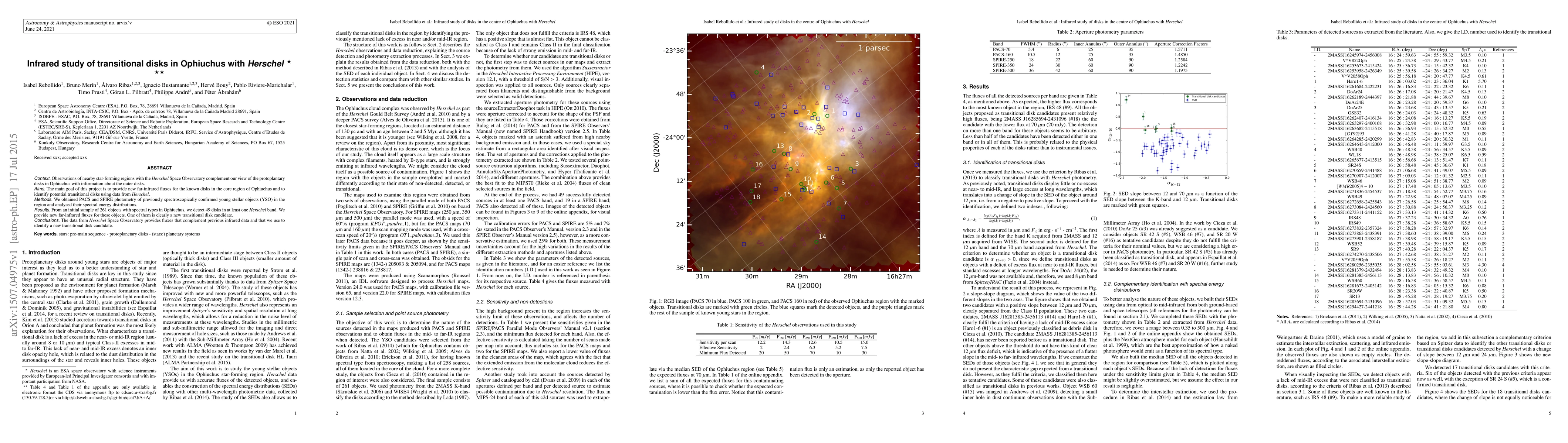 This paper uses Herschel Space Observatory data to obtain new far-infrared fluxes for protoplanetary disks in Ophiuchus, identifying one new candidate transitional disk. The study analyzes PACS and SPIRE photometry of young stellar objects, revealing significant insights into disk evolution.