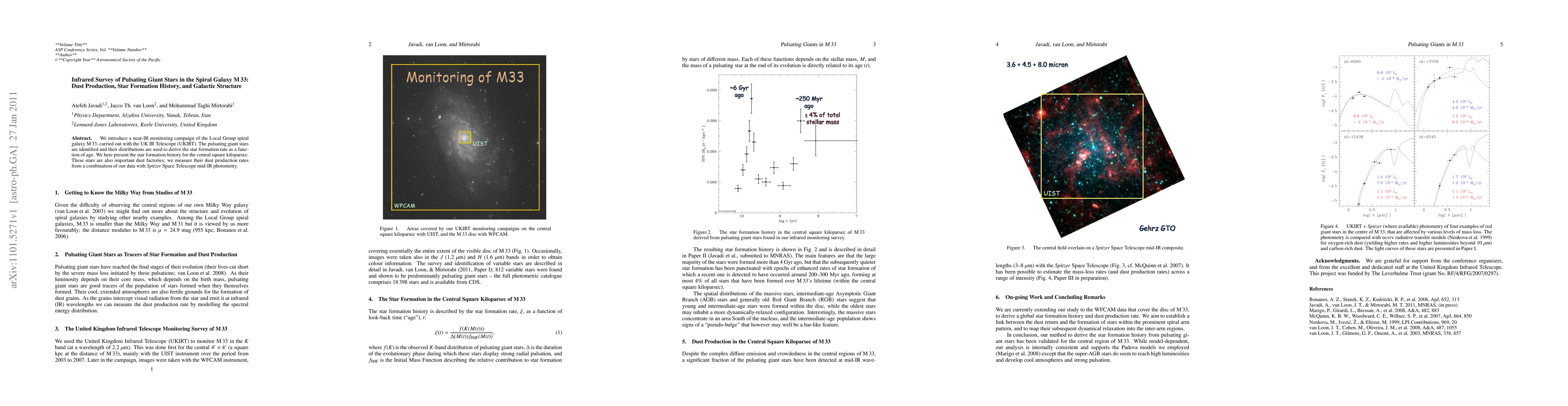 We introduce a near-IR monitoring campaign of the Local Group spiral galaxy M33, carried out with the UK IR Telescope (UKIRT). The pulsating giant stars are identified and their distributions are used to derive the star formation rate as a function of age. We here present the star formation history for the central square kiloparsec. These stars are also important dust factories; we measure their dust production rates from a combination of our data with Spitzer Space Telescope mid-IR photometry.