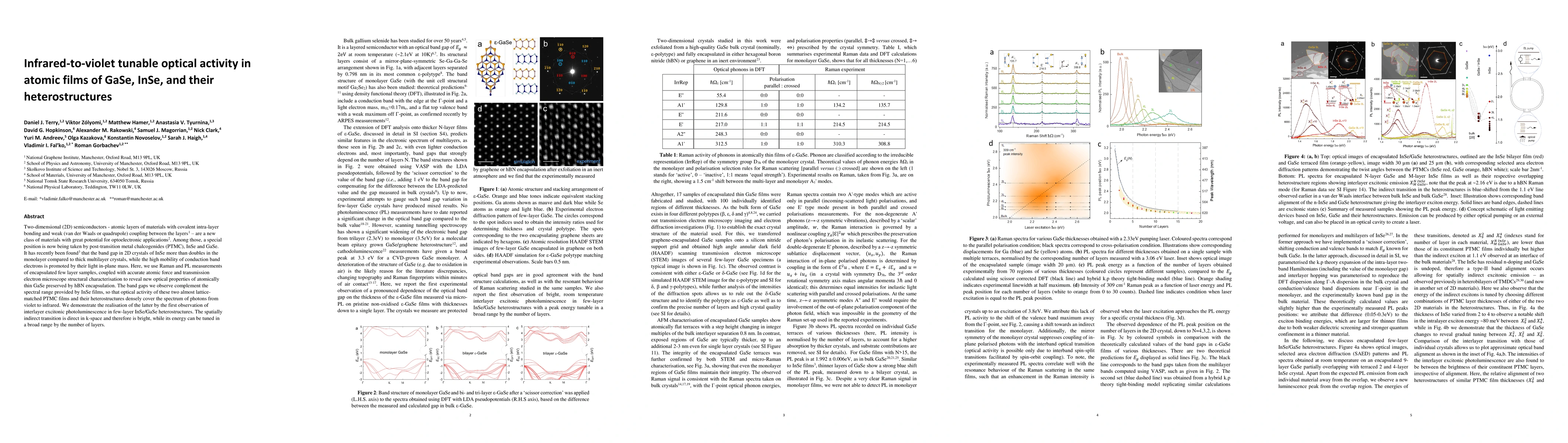 Two-dimensional semiconductors - atomic layers of materials with covalent intra-layer bonding and weak (van der Waals or quadrupole) coupling between the layers - are a new class of materials with great potential for optoelectronic applications. Among those, a special position is now being taken by post-transition metal chalcogenides (PTMC), InSe and GaSe. It has recently been found that the band gap in 2D crystals of InSe more than doubles in the monolayer compared to thick multilayer crystals, while the high mobility of conduction band electrons is promoted by their light in-plane mass. Here, we use Raman and PL measurements of encapsulated few layer samples, coupled with accurate atomic force and transmission electron microscope structural characterisation to reveal new optical properties of atomically thin GaSe preserved by hBN encapsulation. The band gaps we observe complement the spectral range provided by InSe films, so that optical activity of these two almost lattice-matched PTMC films and their heterostructures densely cover the spectrum of photons from violet to infrared. We demonstrate the realisation of the latter by the first observation of interlayer excitonic photoluminescence in few-layer InSe-GaSe heterostructures. The spatially indirect transition is direct in k-space and therefore is bright, while its energy can be tuned in a broad range by the number of layers.
