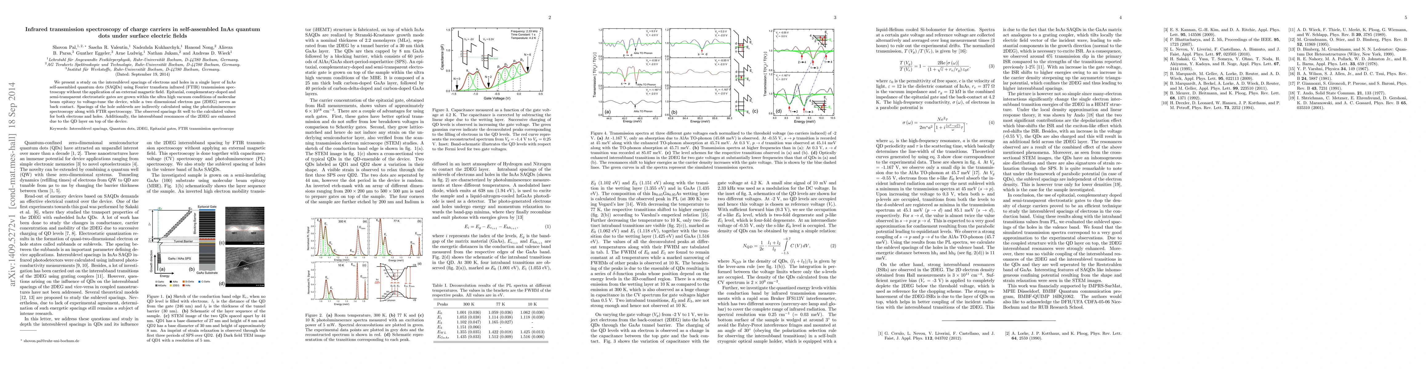 We present a study on the intersublevel spacings of electrons and holes in a single layer of InAs self-assembled quantum dots (SAQDs) using Fourier transform infrared (FTIR) transmission spectroscopy without the application of an external magnetic field. Epitaxial, complementary-doped and semi-transparent electrostatic gates are grown within the ultra high vacuum conditions of molecular beam epitaxy to voltage-tune the device, while a two dimensional electron gas (2DEG) serves as back contact. Spacings of the hole sublevels are indirectly calculated using the photoluminescence spectroscopy along with FTIR spectroscopy. The observed spacings fit well to the calculated values for both electrons and holes. Additionally, the intersubband resonances of the 2DEG are enhanced due to the QD layer on top of the device.