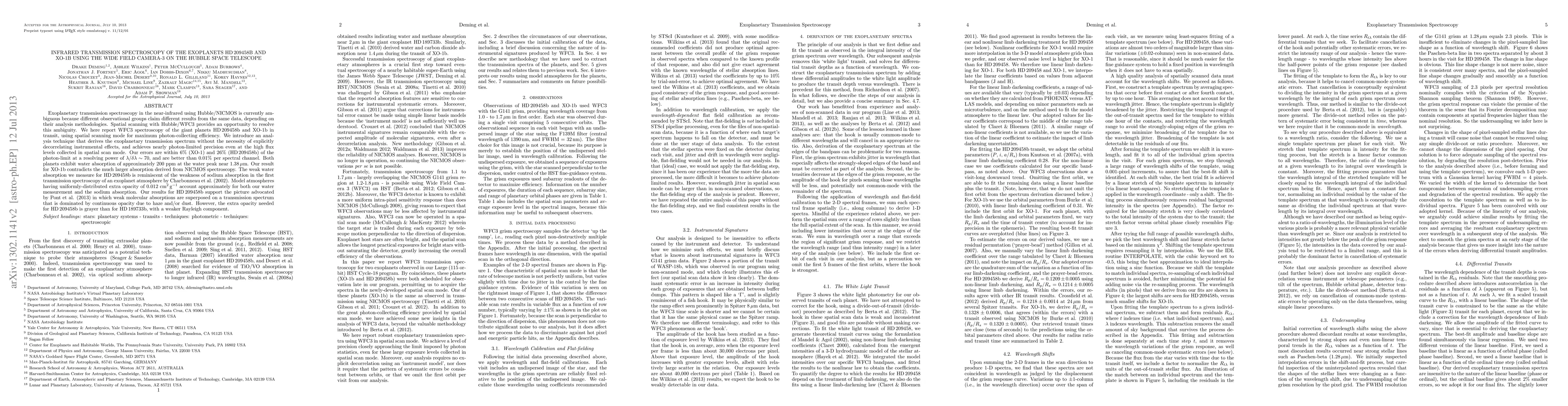 Exoplanetary transmission spectroscopy in the near-infrared using Hubble/NICMOS is currently ambiguous because different observational groups claim different results from the same data, depending on their analysis methodologies. Spatial scanning with Hubble/WFC3 provides an opportunity to resolve this ambiguity. We here report WFC3 spectroscopy of the giant planets HD209458b and XO-1b in transit, using spatial scanning mode for maximum photon-collecting efficiency. We introduce an analysis technique that derives the exoplanetary transmission spectrum without the necessity of explicitly decorrelating instrumental effects, and achieves nearly photon-limited precision even at the high flux levels collected in spatial scan mode. Our errors are within 6-percent (XO-1) and 26-percent (HD209458b) of the photon-limit at a spectral resolving power of 70, and are better than 0.01-percent per spectral channel. Both planets exhibit water absorption of approximately 200 ppm at the water peak near 1.38 microns. Our result for XO-1b contradicts the much larger absorption derived from NICMOS spectroscopy. The weak water absorption we measure for HD209458b is reminiscent of the weakness of sodium absorption in the first transmission spectroscopy of an exoplanet atmosphere by Charbonneau et al. (2002). Model atmospheres having uniformly-distributed extra opacity of 0.012 cm^2 per gram account approximately for both our water measurement and the sodium absorption in this planet. Our results for HD209458b support the picture advocated by Pont et al. (2013) in which weak molecular absorptions are superposed on a transmission spectrum that is dominated by continuous opacity due to haze and/or dust. However, the extra opacity needed for HD209458b is grayer than for HD189733b, with a weaker Rayleigh component.