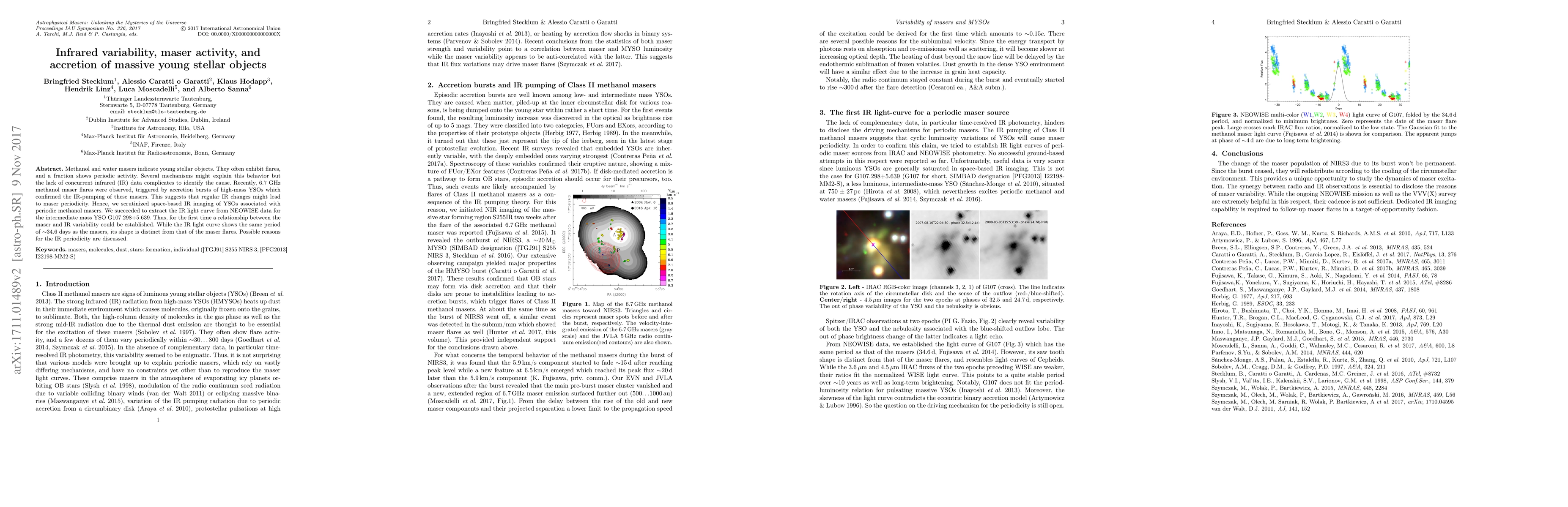 This study establishes a relationship between infrared variability and periodic methanol maser activity in massive young stellar objects (YSOs), using NEOWISE data for YSO G107.298+5.639. The IR light curve exhibits a ~34.6-day periodicity matching the maser flares, suggesting a connection to accretion bursts.
