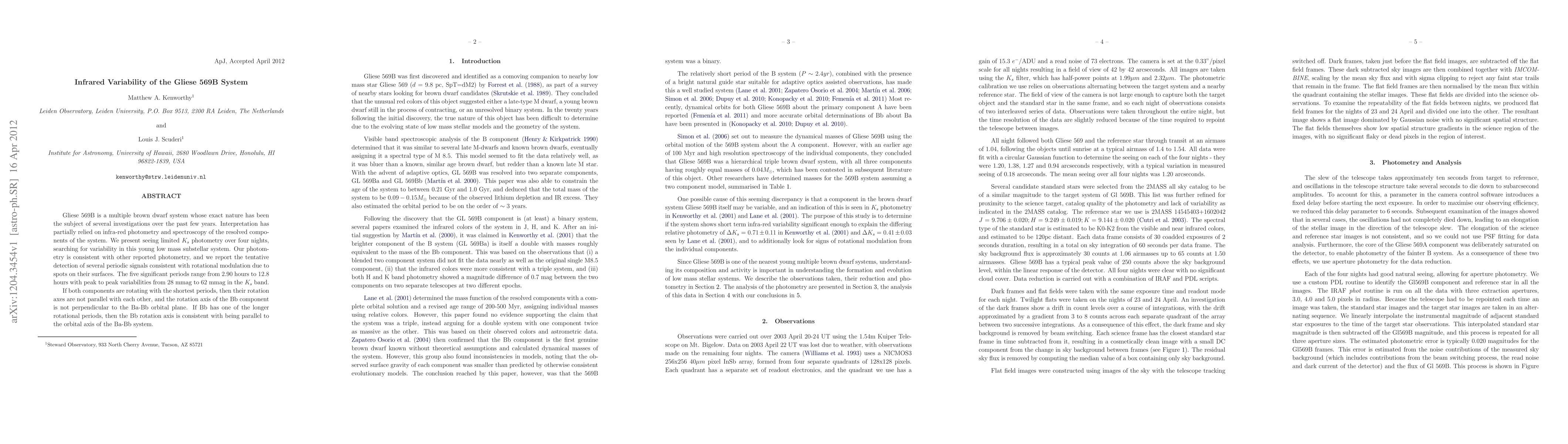 Gliese 569B is a multiple brown dwarf system whose exact nature has been the subject of several investigations over the past few years. Interpretation has partially relied on infra-red photometry and spectroscopy of the resolved components of the system. We present seeing limited Ks photometry over four nights, searching for variability in this young low mass substellar system. Our photometry is consistent with other reported photometry, and we report the tentative detection of several periodic signals consistent with rotational modulation due to spots on their surfaces. The five significant periods range from 2.90 hours to 12.8 hours with peak to peak variabilities from 28 mmag to 62 mmag in the Ks band. If both components are rotating with the shortest periods, then their rotation axes are not parallel with each other, and the rotation axis of the Bb component is not perpendicular to the Ba-Bb orbital plane. If Bb has one of the longer rotational periods, then the Bb rotation axis is consistent with being parallel to the orbital axis of the Ba-Bb system.
