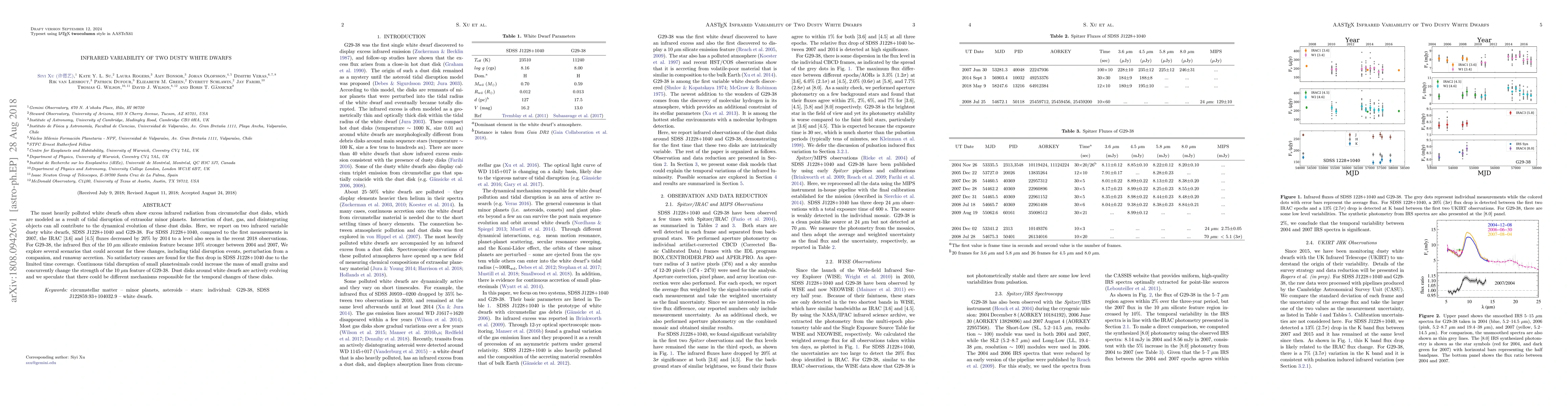 This paper investigates the infrared variability of two dusty white dwarfs, SDSS J1228+1040 and G29-38, finding a significant decrease in infrared flux for SDSS J1228+1040 and an increase in the silicate emission feature for G29-38. The study explores potential causes such as tidal disruption events and accretion but does not identify definitive mechanisms for the observed flux changes.
