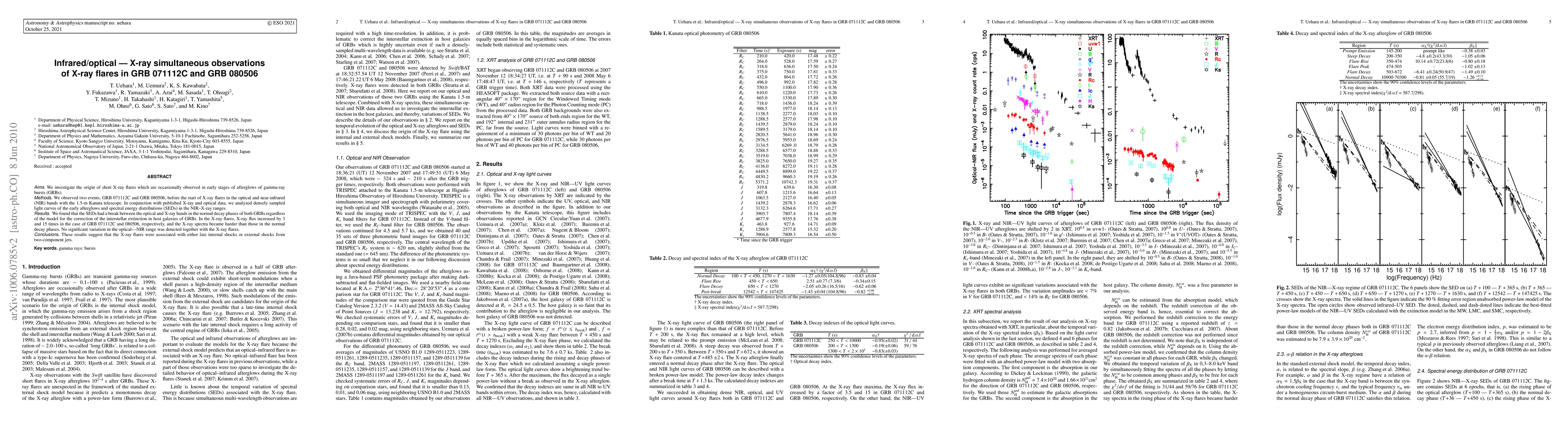 This paper investigates the origins of short X-ray flares in the early afterglows of GRBs 071112C and 080506, finding that X-ray flux increases significantly while optical-NIR bands remain unchanged, suggesting flares are likely due to internal or external shocks from two-component jets.