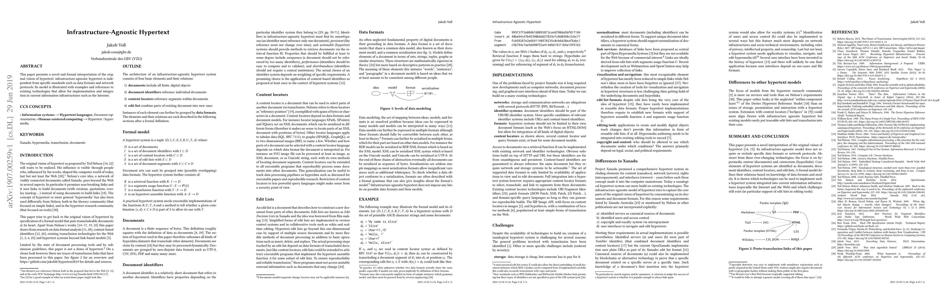 This paper presents a novel and formal interpretation of the original vision of hypertext: infrastructure-agnostic hypertext is independent from specific standards such as data formats and network protocols. Its model is illustrated with examples and references to existing technologies that allow for implementation and integration in current information infrastructures such as the Internet.