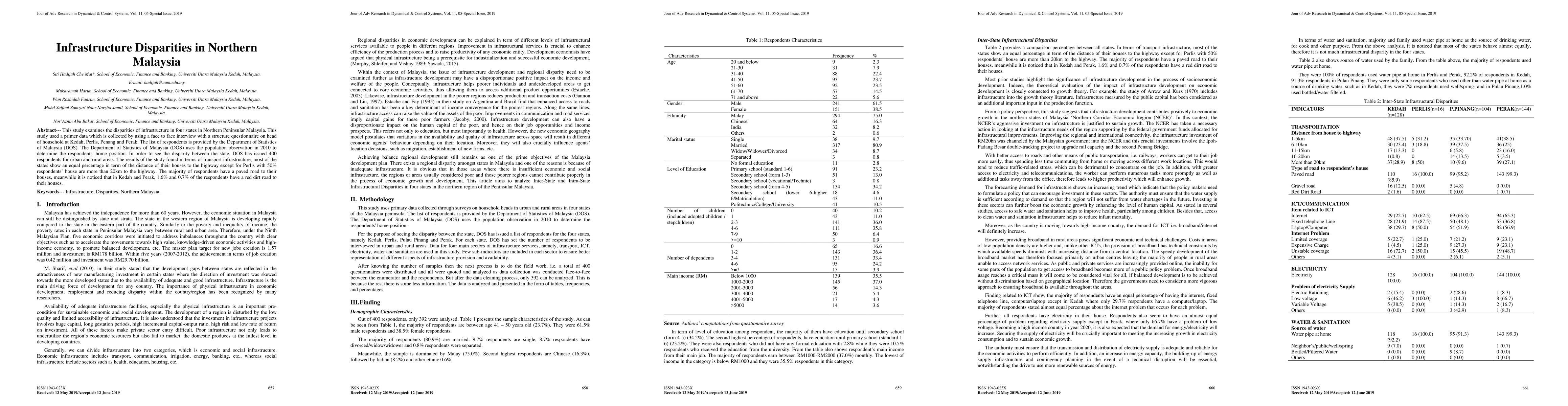 This study investigates the infrastructure disparities among four northern Malaysian states—Kedah, Perlis, Penang, and Perak—using primary data collected via face-to-face interviews with household heads, guided by a structured questionnaire. The respondent list was sourced from the Department of Statistics Malaysia based on the 2010 population census.