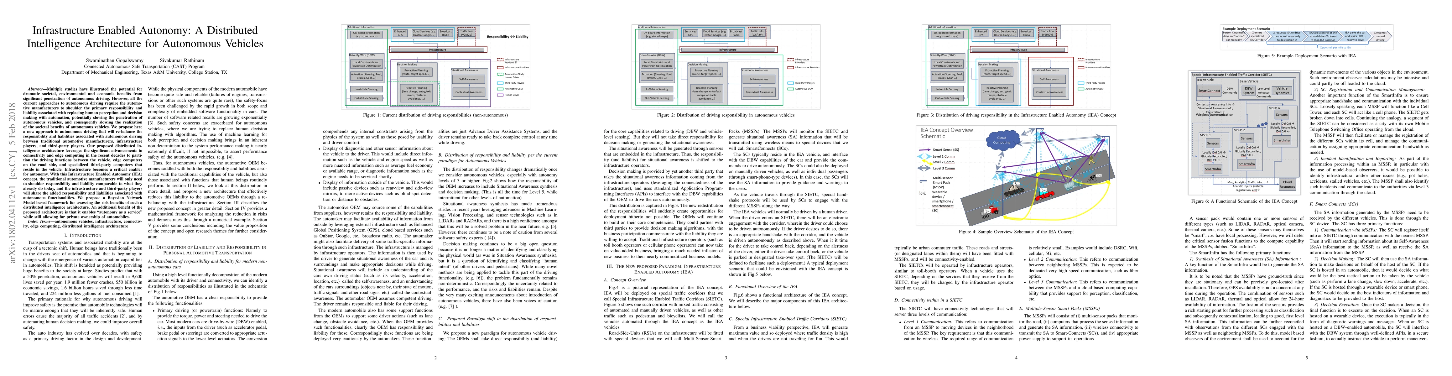 This paper proposes a distributed intelligence architecture for autonomous vehicles that shifts responsibility and liability from automotive manufacturers to infrastructure and third-party players, leveraging connectivity and edge computing. The Infrastructure Enabled Autonomy (IEA) concept allows for "autonomy as a service" while maintaining private vehicle ownership, and employs a Bayesian Network Model to assess risk benefits.
