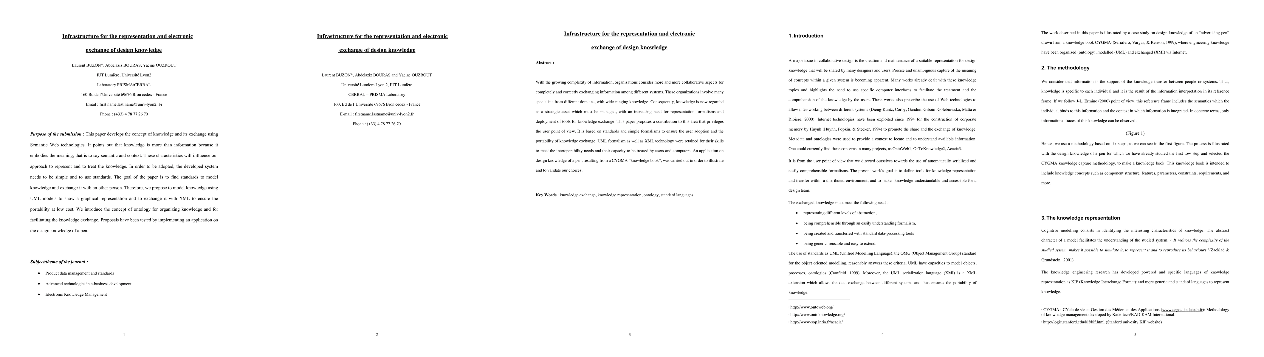 This paper develops the concept of knowledge and its exchange using Semantic Web technologies. It points out that knowledge is more than information because it embodies the meaning, that is to say semantic and context. These characteristics will influence our approach to represent and to treat the knowledge. In order to be adopted, the developed system needs to be simple and to use standards. The goal of the paper is to find standards to model knowledge and exchange it with an other person. Therefore, we propose to model knowledge using UML models to show a graphical representation and to exchange it with XML to ensure the portability at low cost. We introduce the concept of ontology for organizing knowledge and for facilitating the knowledge exchange. Proposals have been tested by implementing an application on the design knowledge of a pen.