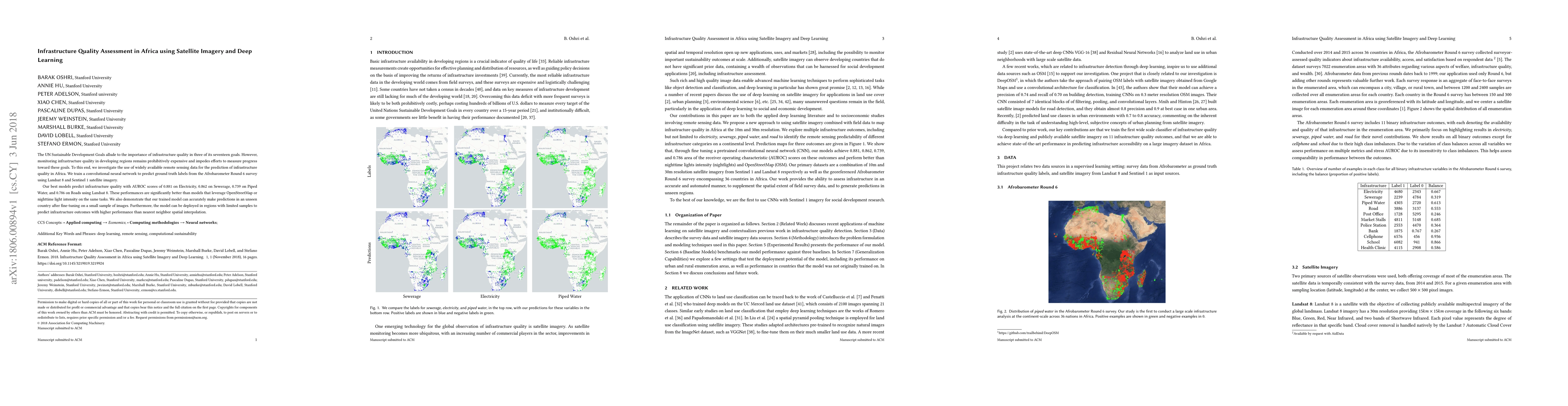 The UN Sustainable Development Goals allude to the importance of infrastructure quality in three of its seventeen goals. However, monitoring infrastructure quality in developing regions remains prohibitively expensive and impedes efforts to measure progress toward these goals. To this end, we investigate the use of widely available remote sensing data for the prediction of infrastructure quality in Africa. We train a convolutional neural network to predict ground truth labels from the Afrobarometer Round 6 survey using Landsat 8 and Sentinel 1 satellite imagery. Our best models predict infrastructure quality with AUROC scores of 0.881 on Electricity, 0.862 on Sewerage, 0.739 on Piped Water, and 0.786 on Roads using Landsat 8. These performances are significantly better than models that leverage OpenStreetMap or nighttime light intensity on the same tasks. We also demonstrate that our trained model can accurately make predictions in an unseen country after fine-tuning on a small sample of images. Furthermore, the model can be deployed in regions with limited samples to predict infrastructure outcomes with higher performance than nearest neighbor spatial interpolation.