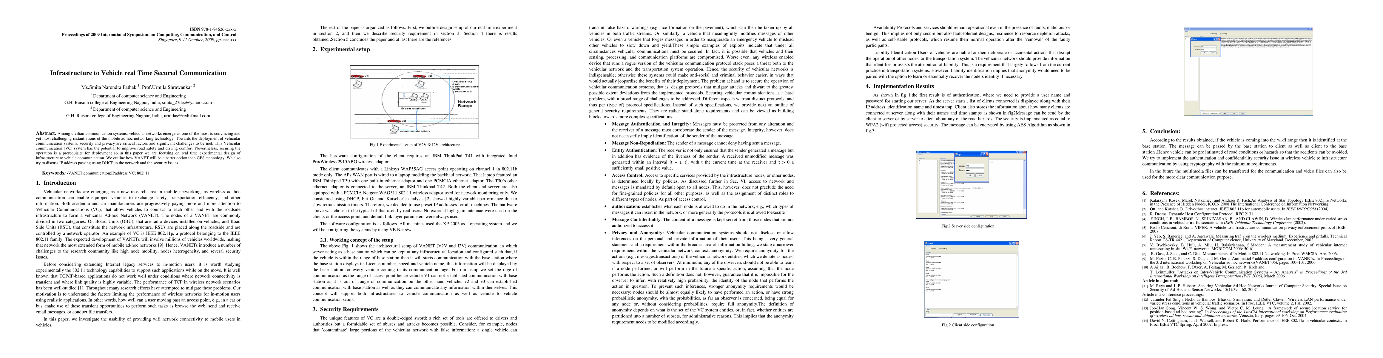 This paper explores the design of secure real-time communication between infrastructure and vehicles in vehicular networks, emphasizing the importance of security and privacy. It proposes VANET as a superior alternative to GPS technology and discusses the implementation of DHCP for IP address management and associated security challenges.