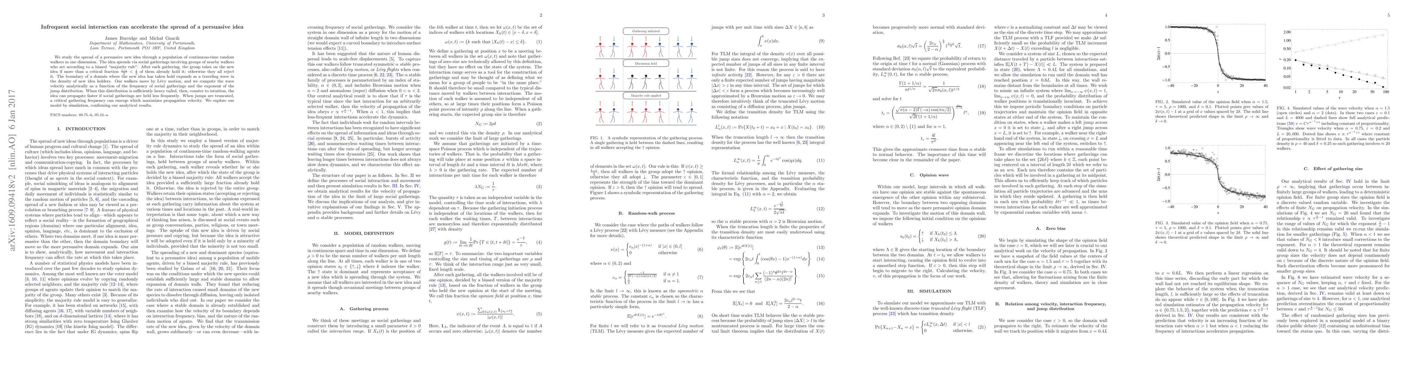 We study the spread of a persuasive new idea through a population of continuous-time random walkers in one dimension. The idea spreads via social gatherings involving groups of nearby walkers who act according to a biased "majority rule": After each gathering, the group takes on the new idea if more than a critical fraction $\frac{1-\varepsilon}{2} < \frac{1}{2}$ of them already hold it; otherwise they all reject it. The boundary of a domain where the new idea has taken hold expands as a traveling wave in the density of new idea holders. Our walkers move by L\'{e}vy motion, and we compute the wave velocity analytically as a function of the frequency of social gatherings and the exponent of the jump distribution. When this distribution is sufficiently heavy tailed, then, counter to intuition, the idea can propagate faster if social gatherings are held less frequently. When jumps are truncated, a critical gathering frequency can emerge which maximizes propagation velocity. We explore our model by simulation, confirming our analytical results.