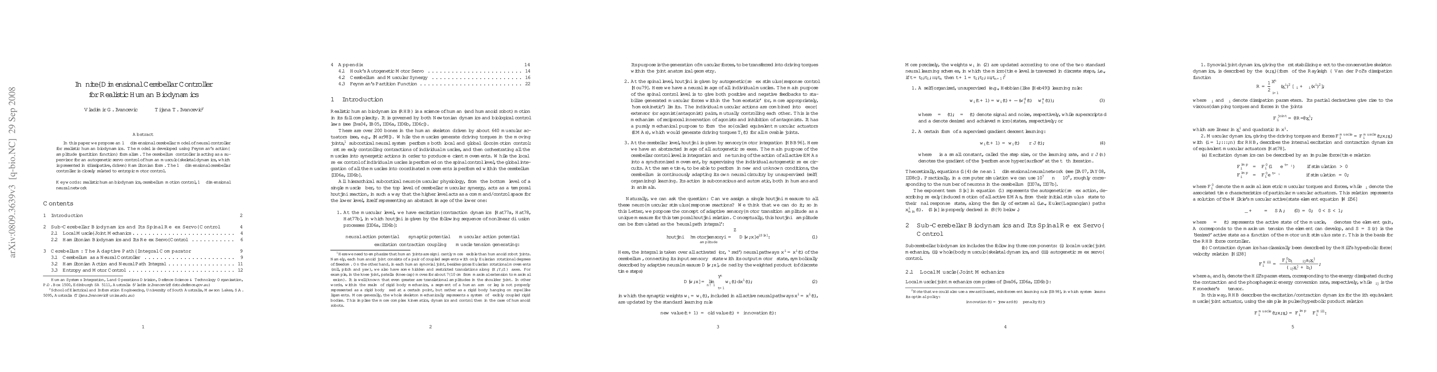 Researchers propose an infinite-dimensional cerebellar model for controlling human biodynamics, using Feynman's action-amplitude formalism to simulate realistic motor control. The model is connected to entropic motor control and aims to create a more accurate understanding of the cerebellum's role in movement.