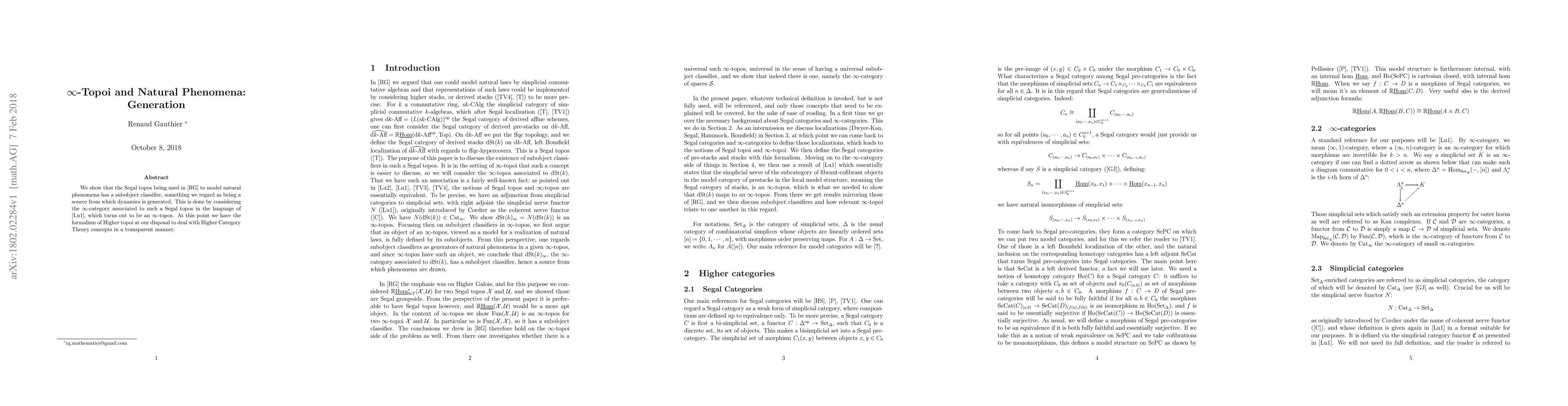 This paper demonstrates that the Segal topos of derived stacks over simplicial commutative $k$-algebras, useful for modeling natural phenomena, possesses a subobject classifier. It argues this classifier is a source of dynamic generation, leveraging the formalism of $\infty$-topoi to clarify Higher Category Theory concepts.
