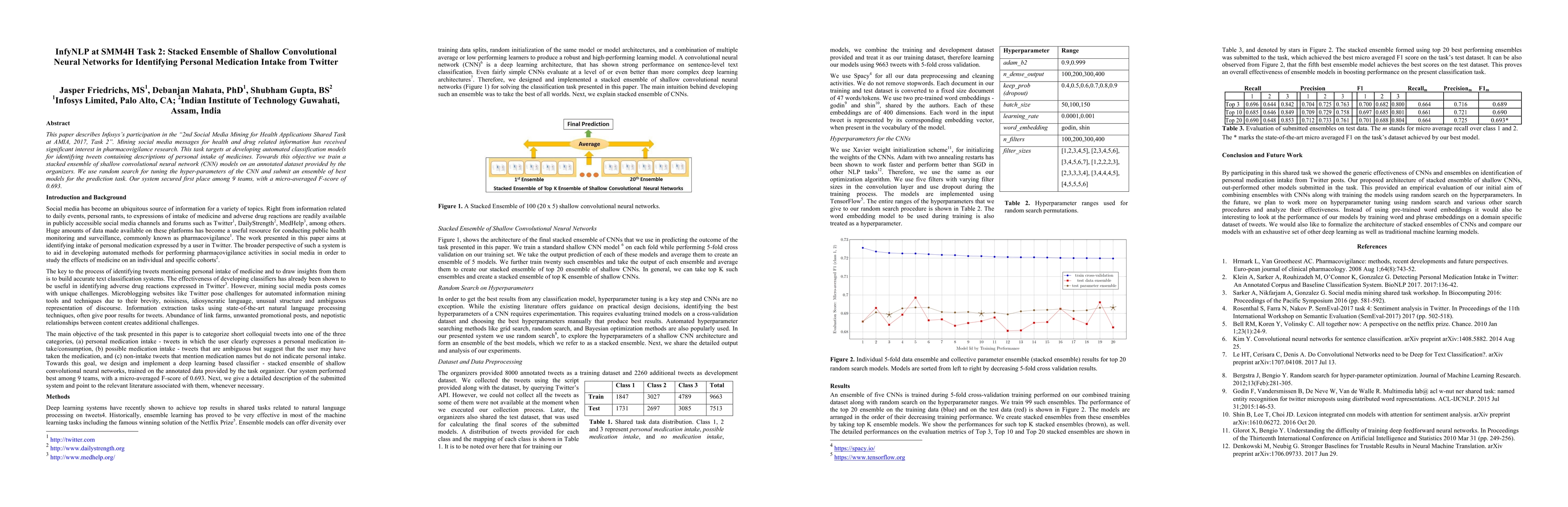This research paper details Infosys's approach to the "2nd Social Media Mining for Health Applications Shared Task at AMIA, 2017, Task 2," focusing on developing a stacked ensemble of shallow convolutional neural networks to classify tweets about personal medication intake. The team secured first place with an impressive micro-averaged F-score of 0.693, demonstrating the effectiveness of their model in pharmacovigilance research.