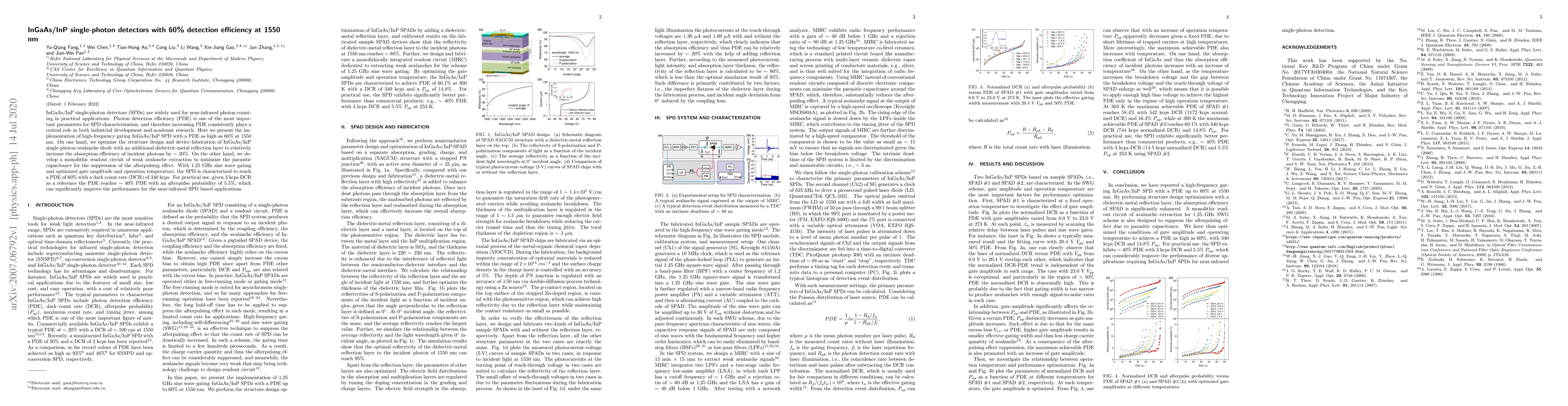 This paper presents a high-efficiency InGaAs/InP single-photon detector (SPD) achieving a photon detection efficiency of 60% at 1550 nm, achieved through structural optimization and a novel monolithic readout circuit. The design significantly reduces the afterpulsing effect and improves performance for near-infrared photon counting applications.