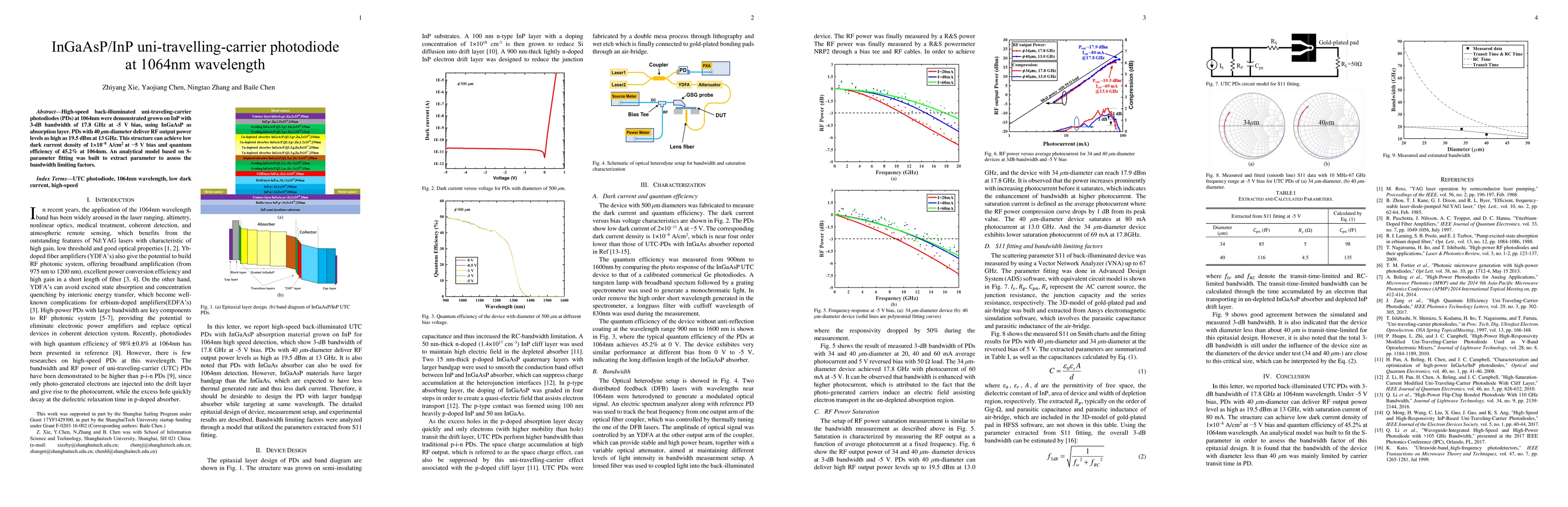 High-speed back-illuminated uni-traveling-carrier photodiodes at 1064nm were demonstrated grown on InP with 3dB bandwidth of 17.8 GHz at -5 V bias, using InGaAsP as absorption layer. PDs with 40um diameter deliver RF output power levels as high as 19.5 dBm at 13 GHz. This structure can achieve low dark current density of 10 nA per cm2 at -5V bias and quantum efficiency of 45.2% at 1064nm. An analytical model based on S-parameter fitting was built to extract parameter to access the bandwidth limiting factors.