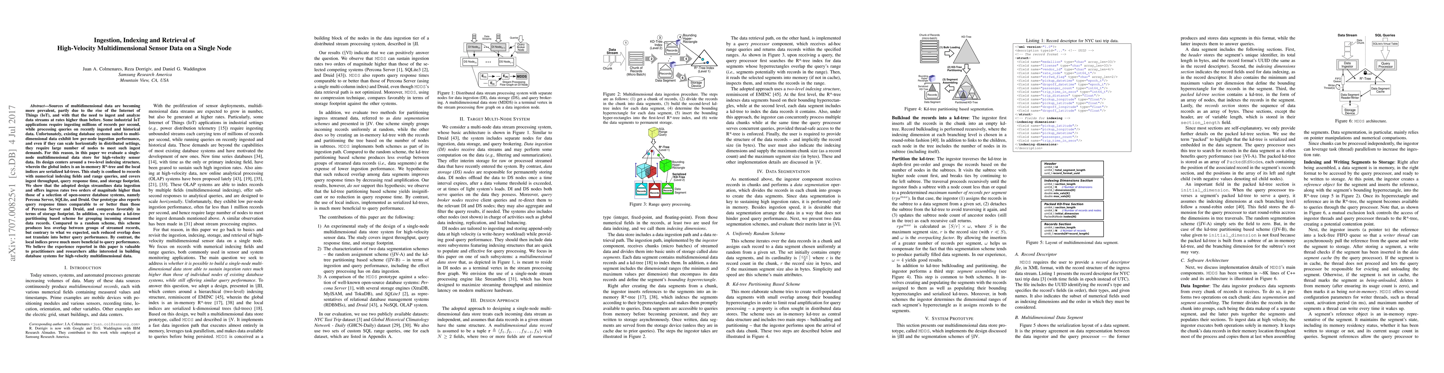 Multidimensional data are becoming more prevalent, partly due to the rise of the Internet of Things (IoT), and with that the need to ingest and analyze data streams at rates higher than before. Some industrial IoT applications require ingesting millions of records per second, while processing queries on recently ingested and historical data. Unfortunately, existing database systems suited to multidimensional data exhibit low per-node ingestion performance, and even if they can scale horizontally in distributed settings, they require large number of nodes to meet such ingest demands. For this reason, in this paper we evaluate a single-node multidimensional data store for high-velocity sensor data. Its design centers around a two-level indexing structure, wherein the global index is an in-memory R*-tree and the local indices are serialized kd-trees. This study is confined to records with numerical indexing fields and range queries, and covers ingest throughput, query response time, and storage footprint. We show that the adopted design streamlines data ingestion and offers ingress rates two orders of magnitude higher than those of Percona Server, SQLite, and Druid. Our prototype also reports query response times comparable to or better than those of Percona Server and Druid, and compares favorably in terms of storage footprint. In addition, we evaluate a kd-tree partitioning based scheme for grouping incoming streamed data records. Compared to a random scheme, this scheme produces less overlap between groups of streamed records, but contrary to what we expected, such reduced overlap does not translate into better query performance. By contrast, the local indices prove much more beneficial to query performance. We believe the experience reported in this paper is valuable to practitioners and researchers alike interested in building database systems for high-velocity multidimensional data.