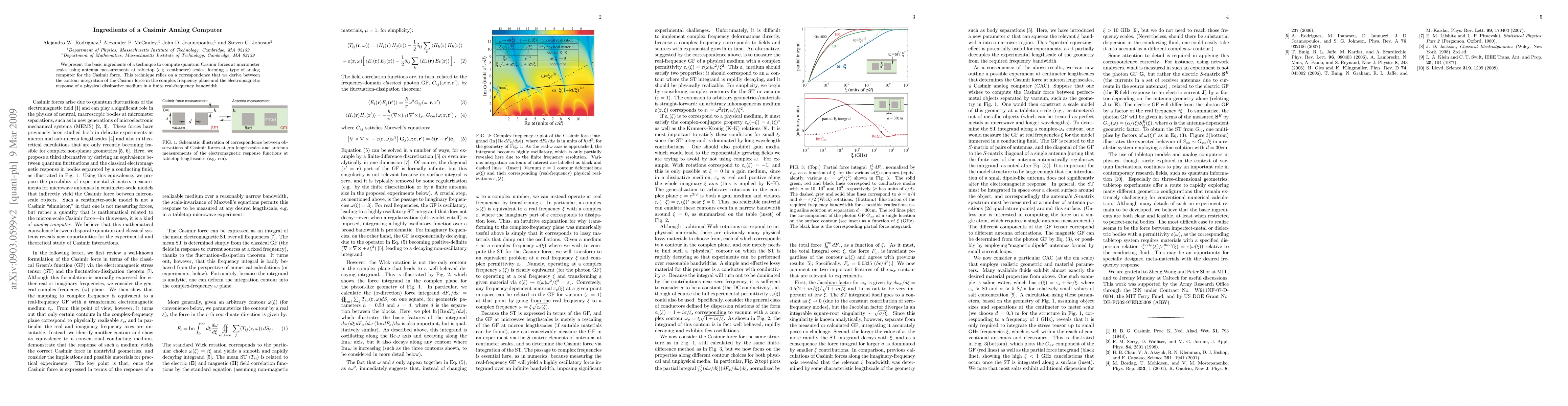 This paper outlines a method to compute quantum Casimir forces using antenna measurements, creating an analog computer for the Casimir force by correlating contour integration in the complex frequency plane with the electromagnetic response of a dissipative medium.