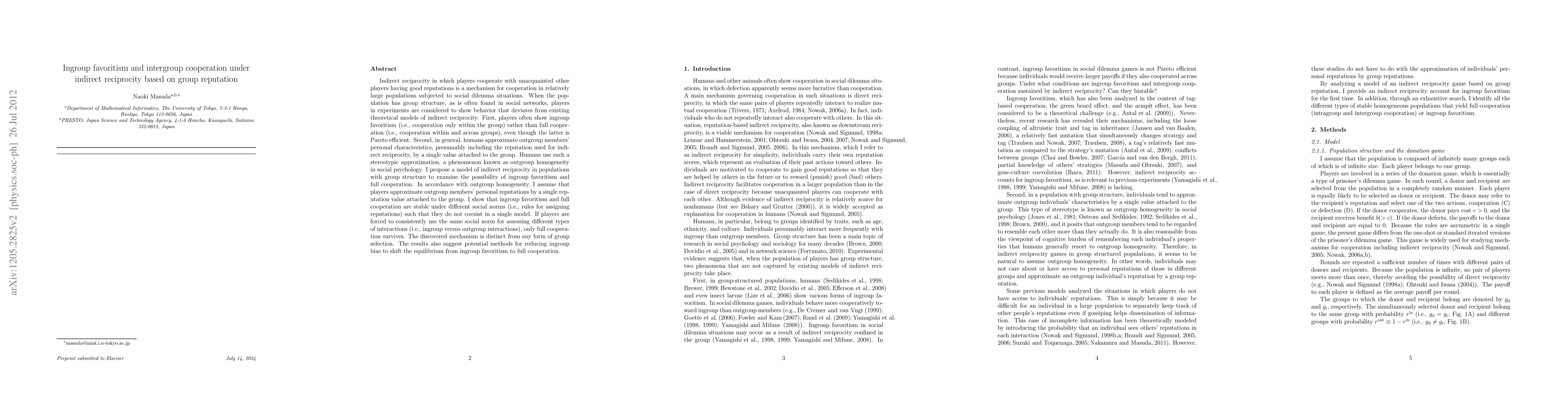The paper proposes a model of indirect reciprocity with group structure, incorporating outgroup homogeneity and analyzing the stability of ingroup favoritism and full cooperation under various social norms.