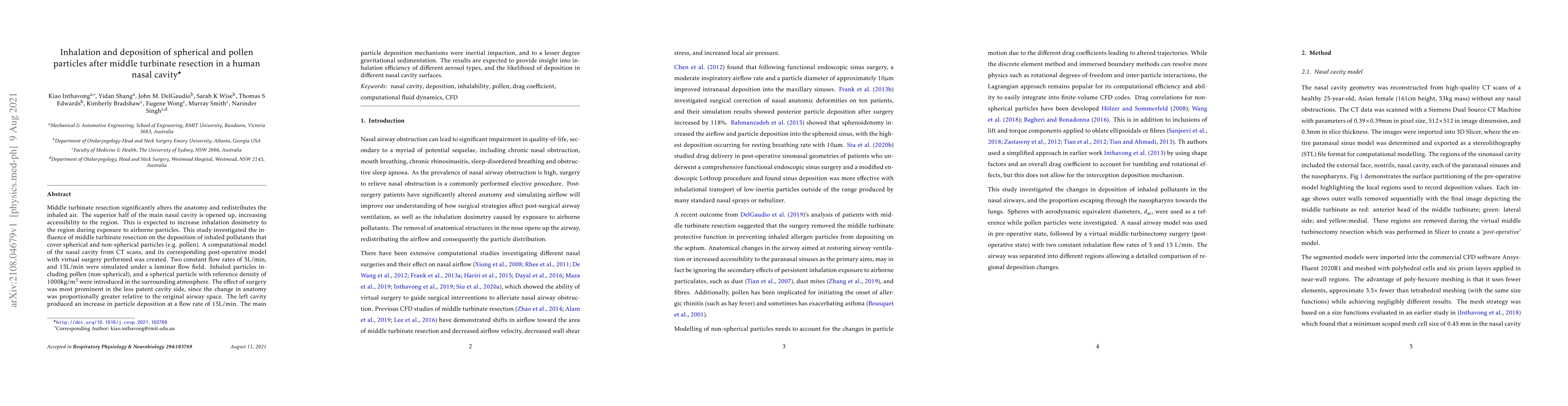 The study employed a computational fluid dynamics (CFD) model of the human nasal cavity, both pre- and post-middle turbinate resection, to simulate inhalation and particle deposition at flow rates of 5 L/min and 15 L/min.