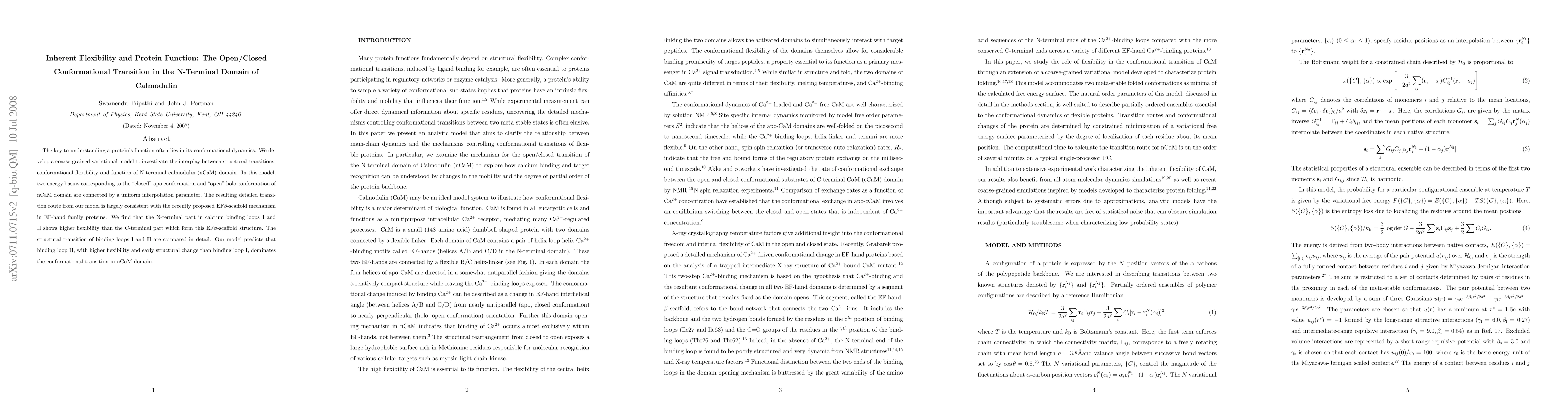 This study develops a model to explore the conformational flexibility and transitions of calmodulin's N-terminal domain, finding that binding loop II, with higher flexibility, leads the conformational change from the "closed" to "open" state, supporting the EF$\beta$-scaffold mechanism.