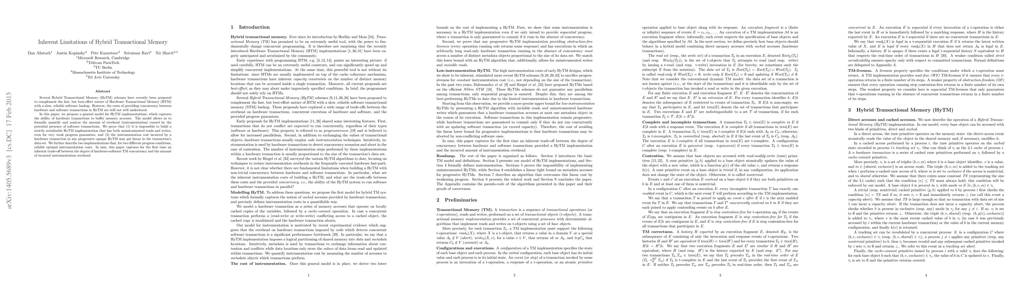 This paper proposes a general model for Hybrid Transactional Memory (HyTM) implementations, demonstrating inherent limitations in achieving high concurrency between hardware and software transactions without significant overhead. It proves that strictly serializable HyTM with uninstrumented reads and writes is impossible, and that hardware transactions incur linear instrumentation costs relative to their data set size.