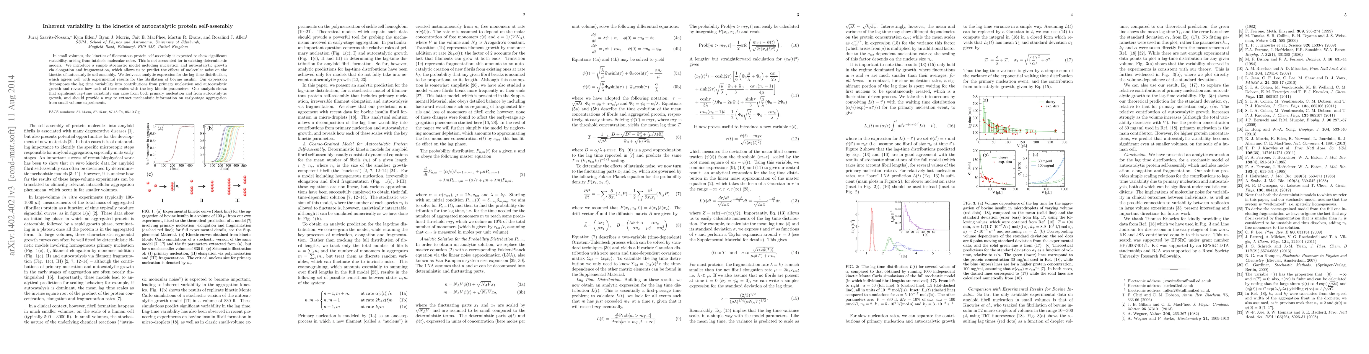 In small volumes, the kinetics of filamentous protein self-assembly is expected to show significant variability, arising from intrinsic molecular noise. This is not accounted for in existing deterministic models. We introduce a simple stochastic model including nucleation and autocatalytic growth via elongation and fragmentation, which allows us to predict the effects of molecular noise on the kinetics of autocatalytic self-assembly. We derive an analytic expression for the lag-time distribution, which agrees well with experimental results for the fibrillation of bovine insulin. Our expression decomposes the lag time variability into contributions from primary nucleation and autocatalytic growth and reveals how each of these scales with the key kinetic parameters. Our analysis shows that significant lag-time variability can arise from both primary nucleation and from autocatalytic growth, and should provide a way to extract mechanistic information on early-stage aggregation from small-volume experiments.
