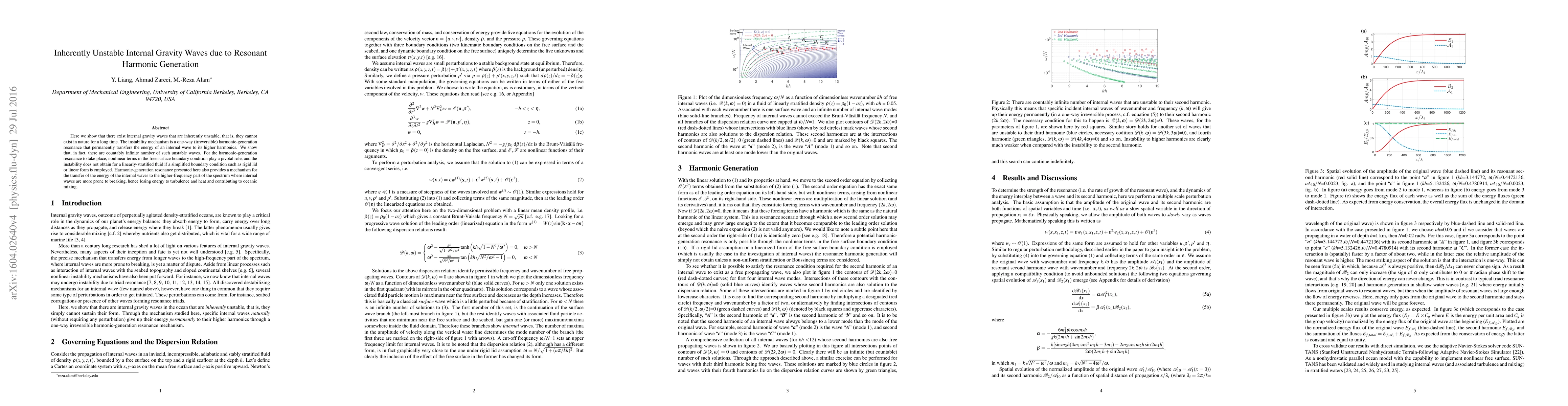 This paper demonstrates the existence of inherently unstable internal gravity waves due to a one-way harmonic-generation resonance that irreversibly transfers wave energy to higher harmonics. The study reveals that nonlinear terms in the free surface boundary condition are crucial for this instability, which does not occur in linearly stratified fluids under simplified boundary conditions.