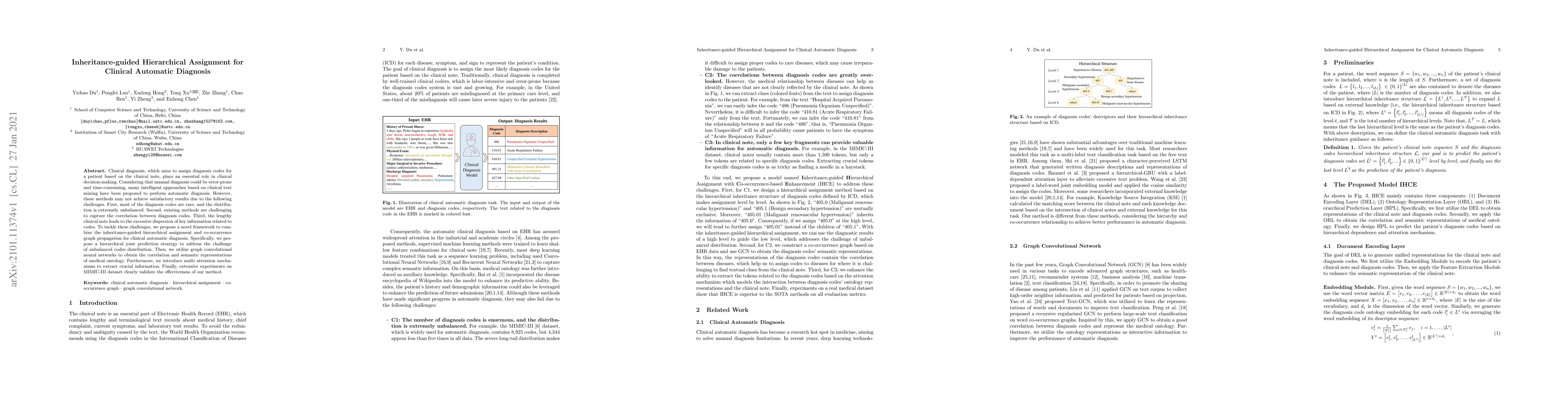 This paper proposes a novel framework combining inheritance-guided hierarchical assignment and co-occurrence graph propagation to address challenges in automatic clinical diagnosis, including unbalanced diagnosis code distribution and information dispersion in lengthy clinical notes. The method uses hierarchical joint prediction and graph convolutional networks to capture correlations between diagnosis codes, validated by experiments on the MIMIC-III dataset.