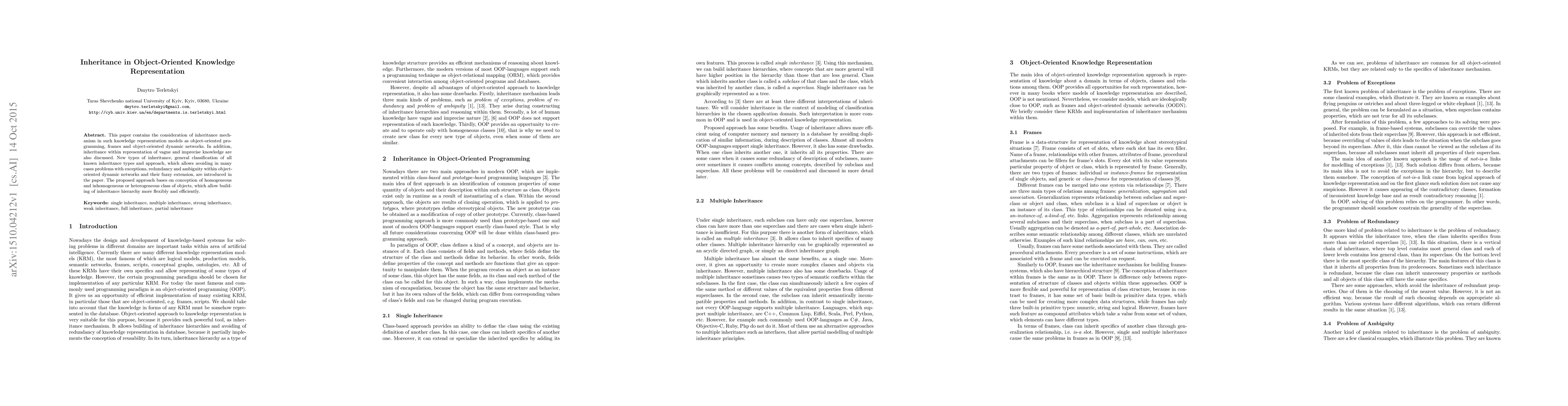 This paper contains the consideration of inheritance mechanism in such knowledge representation models as object-oriented programming, frames and object-oriented dynamic networks. In addition, inheritance within representation of vague and imprecise knowledge are also discussed. New types of inheritance, general classification of all known inheritance types and approach, which allows avoiding in many cases problems with exceptions, redundancy and ambiguity within object-oriented dynamic networks and their fuzzy extension, are introduced in the paper. The proposed approach bases on conception of homogeneous and inhomogeneous or heterogeneous class of objects, which allow building of inheritance hierarchy more flexibly and efficiently.