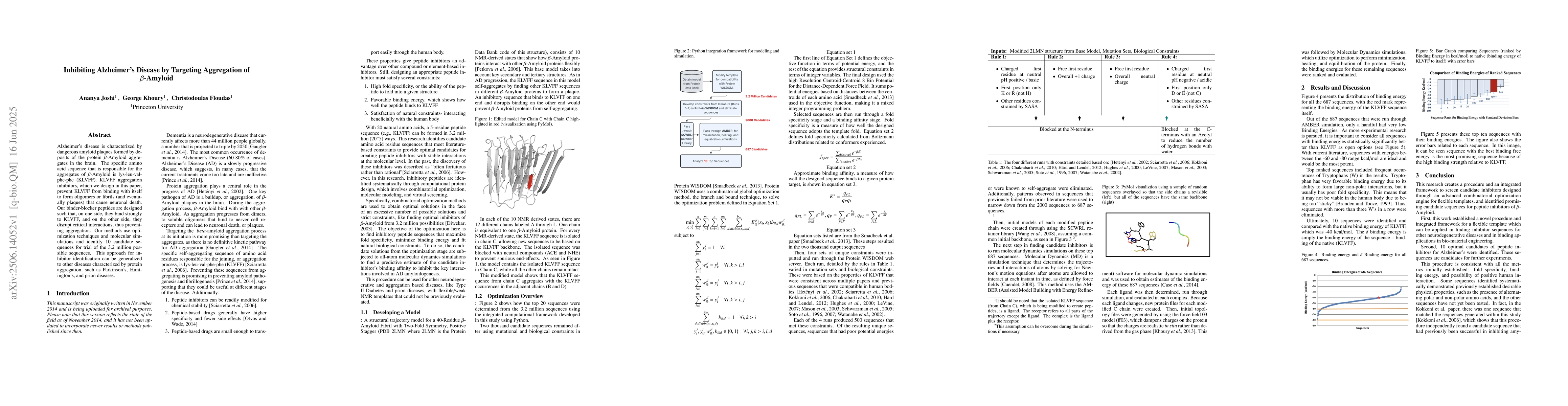 Alzheimer's disease is characterized by dangerous amyloid plaques formed by deposits of the protein Beta-Amyloid aggregates in the brain. The specific amino acid sequence that is responsible for the aggregates of Beta-Amyloid is lys-leu-val-phe-phe (KLVFF). KLVFF aggregation inhibitors, which we design in this paper, prevent KLVFF from binding with itself to form oligomers or fibrils (and eventually plaques) that cause neuronal death. Our binder-blocker peptides are designed such that, on one side, they bind strongly to KLVFF, and on the other side, they disrupt critical interactions, thus preventing aggregation. Our methods use optimization techniques and molecular simulations and identify 10 candidate sequences for trial of the 3.2 million possible sequences. This approach for inhibitor identification can be generalized to other diseases characterized by protein aggregation, such as Parkinson's, Huntington's, and prion diseases.