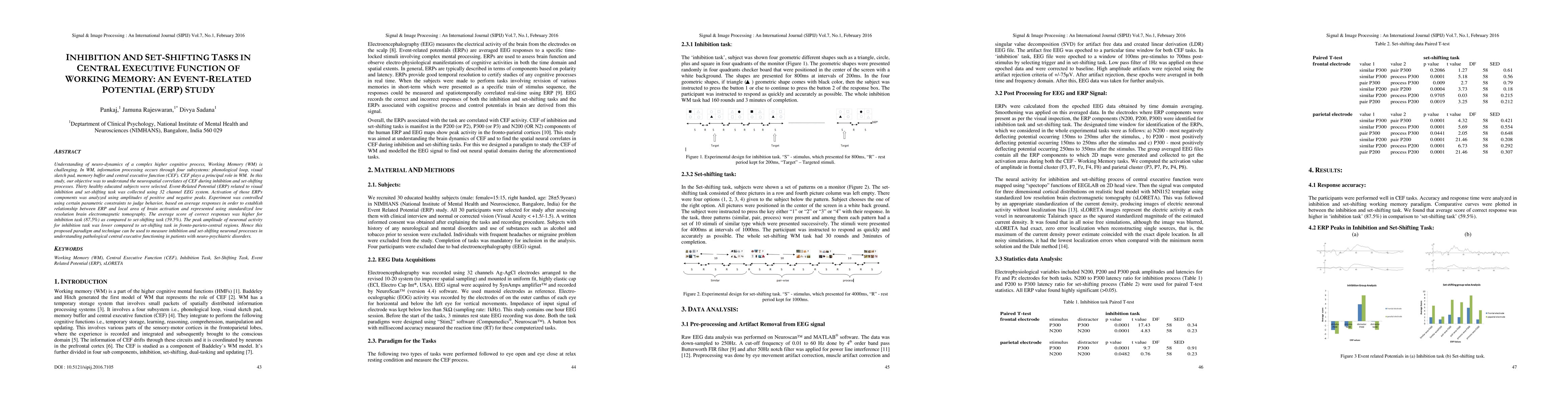 This ERP study investigates the neurospatial correlates of the central executive function (CEF) in working memory during inhibition and set-shifting tasks. Results show higher accuracy in inhibition tasks and greater neuronal activity in fronto-parieto-central regions during set-shifting, suggesting distinct neural mechanisms for these processes.