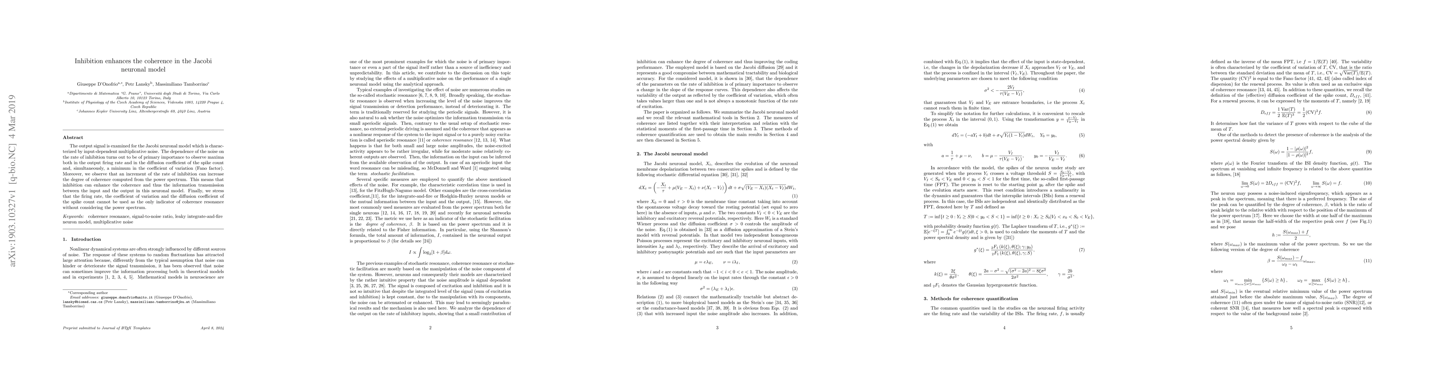 The output signal is examined for the Jacobi neuronal model which is characterized by input-dependent multiplicative noise. The dependence of the noise on the rate of inhibition turns out to be of primary importance to observe maxima both in the output firing rate and in the diffusion coefficient of the spike count and, simultaneously, a minimum in the coefficient of variation (Fano factor). Moreover, we observe that an increment of the rate of inhibition can increase the degree of coherence computed from the power spectrum. This means that inhibition can enhance the coherence and thus the information transmission between the input and the output in this neuronal model. Finally, we stress that the firing rate, the coefficient of variation and the diffusion coefficient of the spike count cannot be used as the only indicator of coherence resonance without considering the power spectrum.