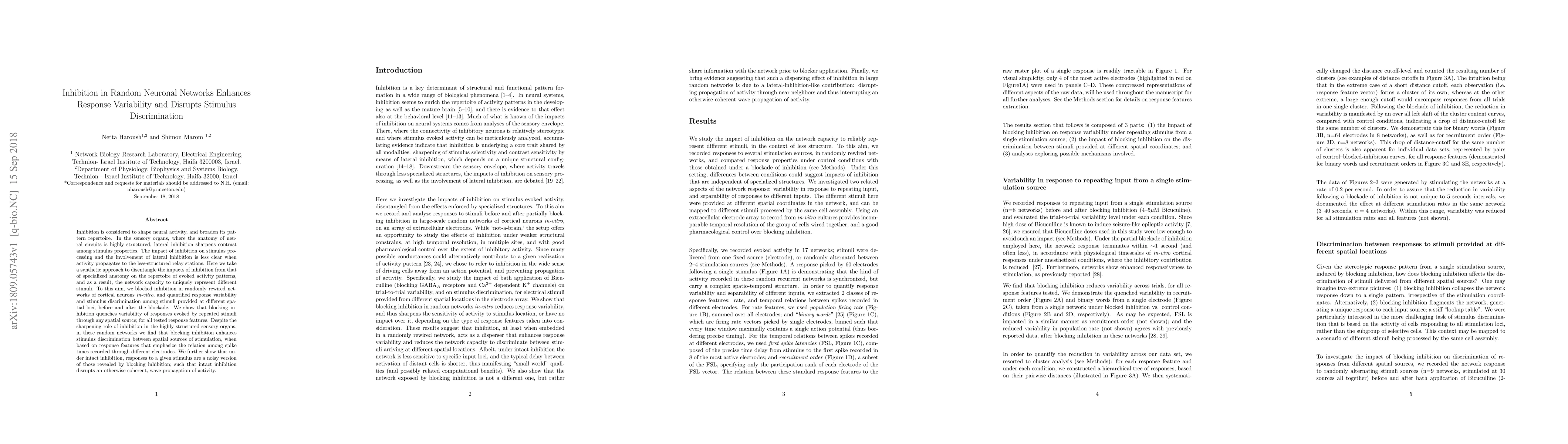 Blocking inhibition in random neuronal networks reduces response variability but paradoxically enhances stimulus discrimination based on spike time relations, while disrupting coherent wave propagation of activity. This suggests that inhibition's role in structured versus less-structured networks diverges significantly.