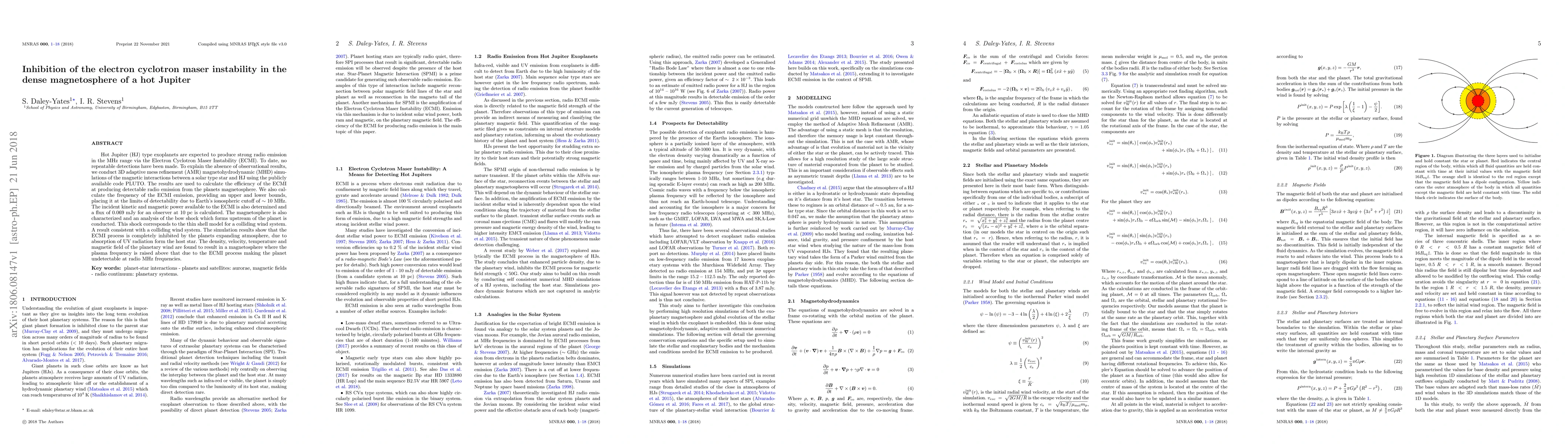 Hot Jupiter (HJ) type exoplanets are expected to produce strong radio emission in the MHz range via the Electron Cyclotron Maser Instability (ECMI). To date, no repeatable detections have been made. To explain the absence of observational results, we conduct 3D adaptive mess refinement (AMR) magnetohydrodynamic (MHD) simulations of the magnetic interactions between a solar type star and HJ using the publicly available code PLUTO. The results are used to calculate the efficiency of the ECMI at producing detectable radio emission from the planets magnetosphere. We also calculate the frequency of the ECMI emission, providing an upper and lower bounds, placing it at the limits of detectability due to Earth's ionospheric cutoff of $\sim 10 \ \mathrm{MHz}$. The incident kinetic and magnetic power available to the ECMI is also determined and a flux of $0.069 \ \mathrm{mJy}$ for an observer at $10 \ \mathrm{pc}$ is calculated. The magnetosphere is also characterized and an analysis of the bow shock which forms upstream of the planet is conducted. This shock corresponds to the thin shell model for a colliding wind system. A result consistent with a colliding wind system. The simulation results show that the ECMI process is completely inhibited by the planets expanding atmosphere, due to absorption of UV radiation form the host star. The density, velocity, temperature and magnetic field of the planetary wind are found to result in a magnetosphere where the plasma frequency is raised above that due to the ECMI process making the planet undetectable at radio MHz frequencies.