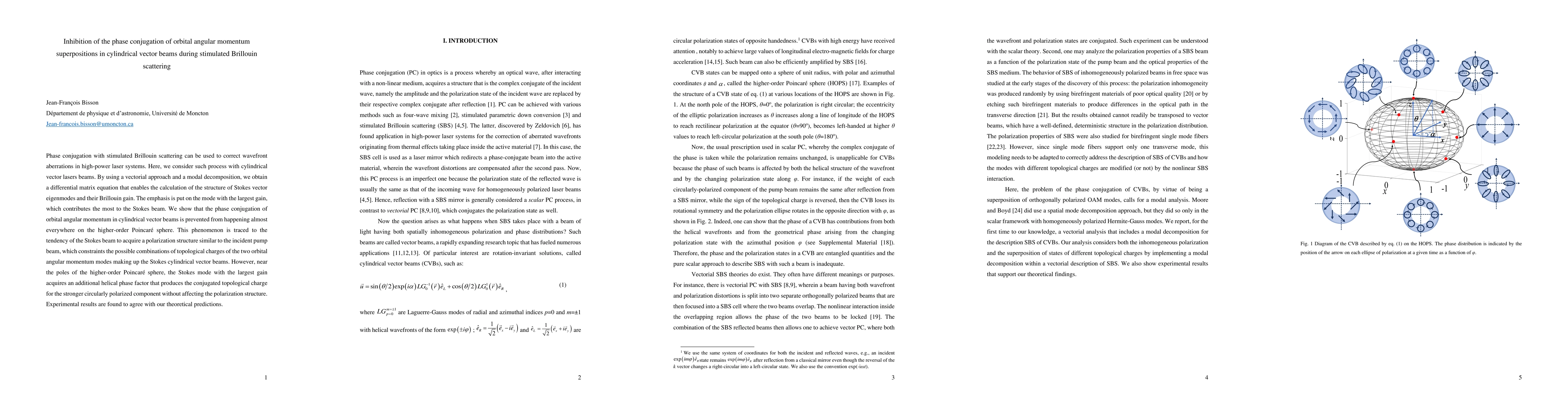 Phase conjugation with stimulated Brillouin scattering can be used to correct wavefront aberrations in high-power laser systems. Here, we consider such process with cylindrical vector lasers beams. By using a vectorial approach and a modal decomposition, we obtain a differential matrix equation that enables the calculation of the structure of Stokes vector eigenmodes and their Brillouin gain. The emphasis is put on the mode with the largest gain, which contributes the most to the Stokes beam. We show that the phase conjugation of orbital angular momentum in cylindrical vector beams is prevented from happening almost everywhere on the higher-order Poincar\'e sphere. This phenomenon is traced to the tendency of the Stokes beam to acquire a polarization structure similar to the incident pump beam, which constraints the possible combinations of topological charges of the two orbital angular momentum modes making up the Stokes cylindrical vector beams. However, near the poles of the higher-order Poincar\'e sphere, the Stokes mode with the largest gain acquires an additional helical phase factor that produces the conjugated topological charge for the stronger circularly polarized component without affecting the polarization structure. Experimental results are found to agree with our theoretical predictions.