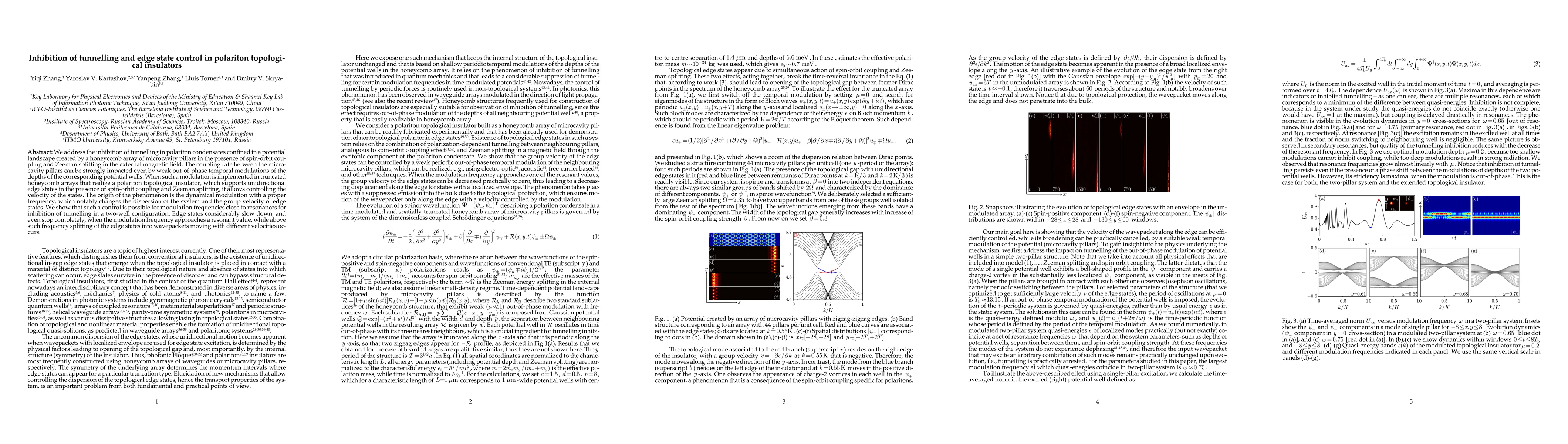 We address the inhibition of tunnelling in polariton condensates confined in a potential landscape created by a honeycomb array of microcavity pillars in the presence of spin-orbit coupling and Zeeman splitting in the external magnetic field. The coupling rate between the microcavity pillars can be strongly impacted even by weak out-of-phase temporal modulations of the depths of the corresponding potential wells. When such a modulation is implemented in truncated honeycomb arrays that realize a polariton topological insulator, which supports unidirectional edge states in the presence of spin-orbit coupling and Zeeman splitting, it allows controlling the velocity of the states. The origin of the phenomenon is the dynamical modulation with a proper frequency, which notably changes the dispersion of the system and the group velocity of edge states. We show that such a control is possible for modulation frequencies close to resonances for inhibition of tunnelling in a two-well configuration. Edge states considerably slow down, and even stop completely, when the modulation frequency approaches a resonant value, while above such frequency splitting of the edge states into wavepackets moving with different velocities occurs.