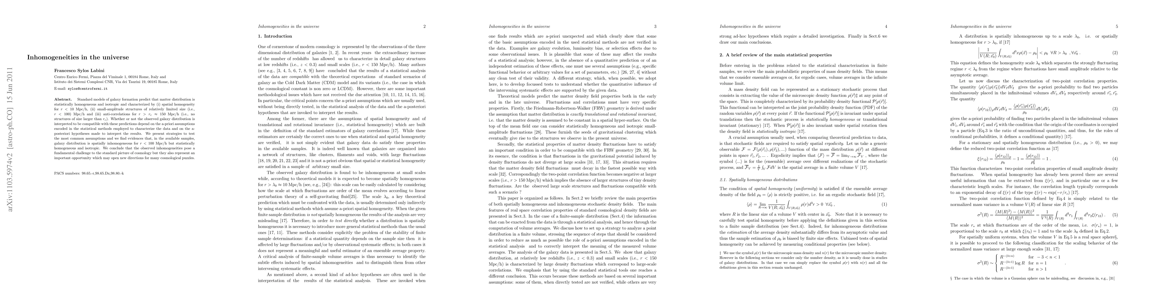 Standard models of galaxy formation predict that matter distribution is statistically homogeneous and isotropic and characterized by (i) spatial homogeneity for r<10 Mpc/h, (ii) small-amplitude structures of relatively limited size (i.e., r<100) Mpc/h and (iii) anti-correlations for r > r_c ~ 150 Mpc/h (i.e., no structures of size larger than r_c). Whether or not the observed galaxy distribution is interpreted to be compatible with these predictions depend on the a-priori assumptions encoded in the statistical methods employed to characterize the data and on the a-posteriori hypotheses made to interpret the results. We present strategies to test the most common assumptions and we find evidences that, in the available samples, galaxy distribution is spatially inhomogeneous for r<100 Mpc/h but statistically homogeneous and isotropic. We conclude that the observed inhomogeneities pose a fundamental challenge to the standard picture of cosmology but they also represent an important opportunity which may open new directions for many cosmological puzzles.
