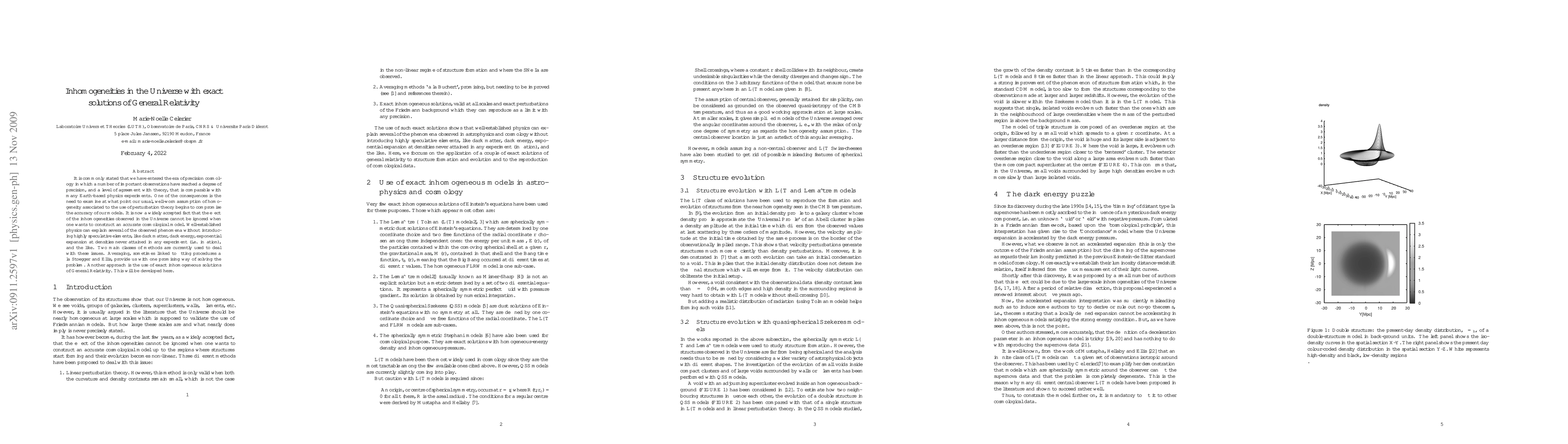 It is commonly stated that we have entered the era of precision cosmology in which a number of important observations have reached a degree of precision, and a level of agreement with theory, that is comparable with many Earth-based physics experiments. One of the consequences is the need to examine at what point our usual, well-worn assumption of homogeneity associated to the use of perturbation theory begins to compromise the accuracy of our models. It is now a widely accepted fact that the effect of the inhomogeneities observed in the Universe cannot be ignored when one wants to construct an accurate cosmological model. Well-established physics can explain several of the observed phenomena without introducing highly speculative elements, like dark matter, dark energy, exponential expansion at densities never attained in any experiment (i.e. inflation), and the like. Two main classes of methods are currently used to deal with these issues. Averaging, sometimes linked to fitting procedures a la Stoegger and Ellis, provide us with one promising way of solving the problem. Another approach is the use of exact inhomogeneous solutions of General Relativity. This will be developed here.