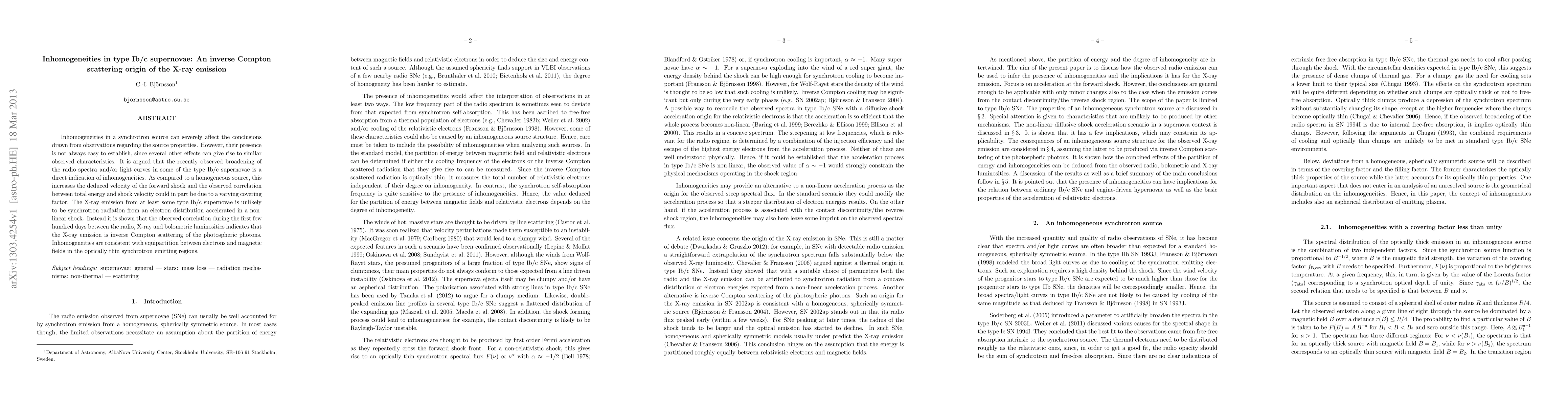 Inhomogeneities in a synchrotron source can severely affect the conclusions drawn from observations regarding the source properties. However, their presence is not always easy to establish, since several other effects can give rise to similar observed characteristics. It is argued that the recently observed broadening of the radio spectra and/or light curves in some of the type Ib/c supernovae is a direct indication of inhomogeneities. As compared to a homogeneous source, this increases the deduced velocity of the forward shock and the observed correlation between total energy and shock velocity could in part be due to a varying covering factor. The X-ray emission from at least some type Ib/c supernovae is unlikely to be synchrotron radiation from an electron distribution accelerated in a non-linear shock. Instead it is shown that the observed correlation during the first few hundred days between the radio, X-ray and bolometric luminosities indicates that the X-ray emission is inverse Compton scattering of the photospheric photons. Inhomogeneities are consistent with equipartition between electrons and magnetic fields in the optically thin synchrotron emitting regions.