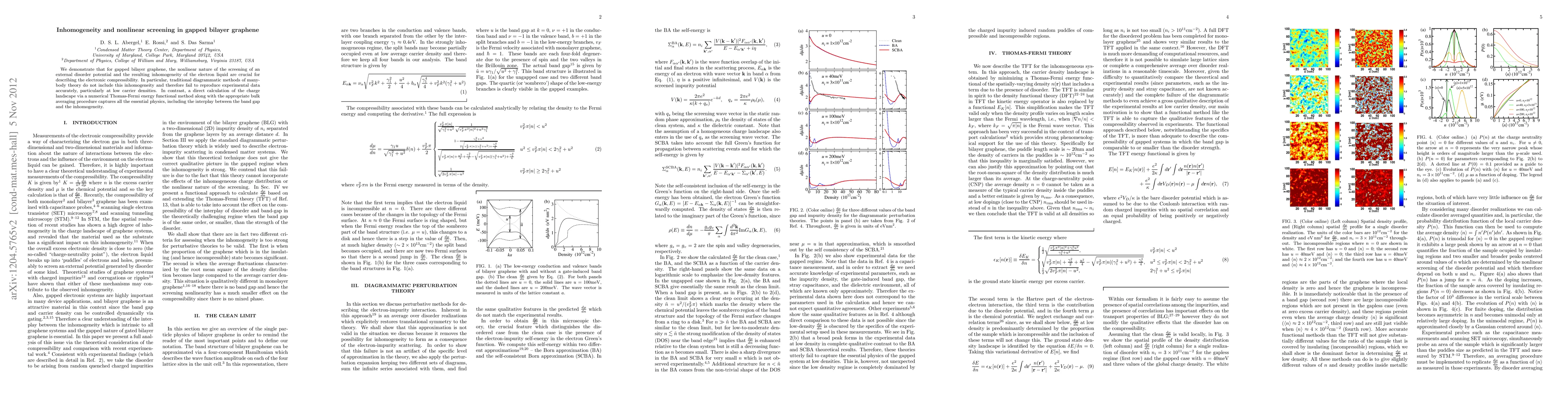The research highlights the importance of nonlinear screening and inhomogeneity in gapped bilayer graphene's electronic compressibility, showing that traditional many-body theory methods fail at low carrier densities. A numerical Thomas-Fermi method combined with bulk averaging accurately captures these complexities.