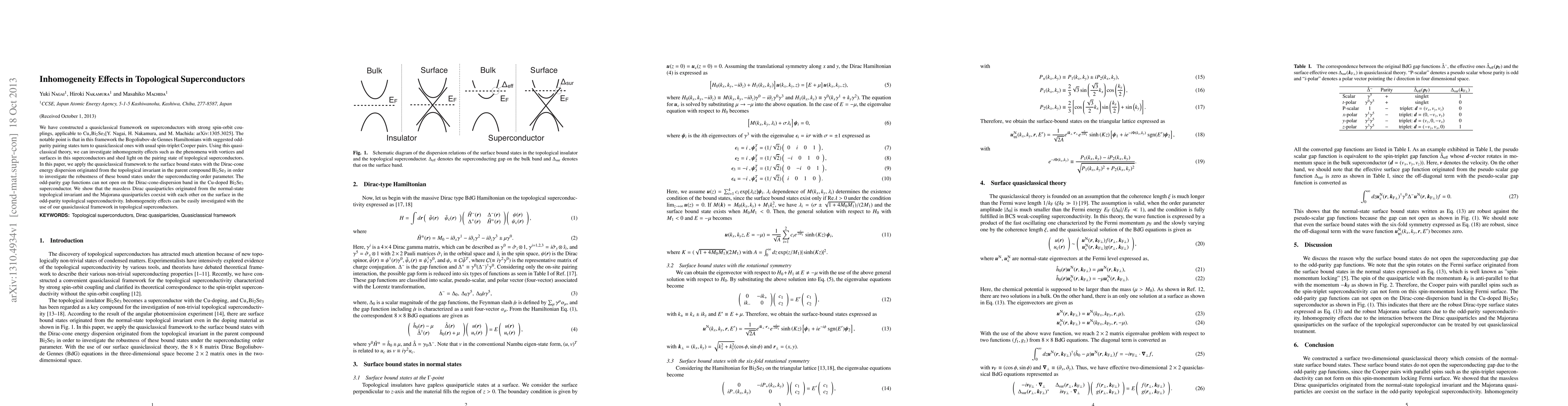 We have constructed a quasiclassical framework on superconductors with strong spin-orbit couplings, applicable to CuxBi2Se3[Y. Nagai, H. Nakamura, and M. Machida: arXiv:1305.3025]. The notable point is that in this framework the Bogoliubov-de Gennes Hamiltonians with suggested odd-parity pairing states turn to quasiclassical ones with usual spin-triplet Cooper pairs. Using this quasiclassical theory, we can investigate inhomogeneity effects such as the phenomena with vortices and surfaces in this superconductors and shed light on the pairing state of topological superconductors. In this paper, we apply the quasiclassical framework to the surface bound states with the Dirac-cone energy dispersion originated from the topological invariant in the parent compound Bi2Se3 in order to investigate the robustness of these bound states under the superconducting order parameter. The odd-parity gap functions can not open on the Dirac-cone-dispersion band in the Cu-doped Bi$_{2}$Se$_{3}$ superconductor. We show that the massless Dirac quasiparticles originated from the normal-state topological invariant and the Majorana quasiparticles coexist with each other on the surface in the odd-parity topological superconductivity. Inhomogeneity effects can be easily investigated with the use of our quasiclassical framework in topological superconductors.