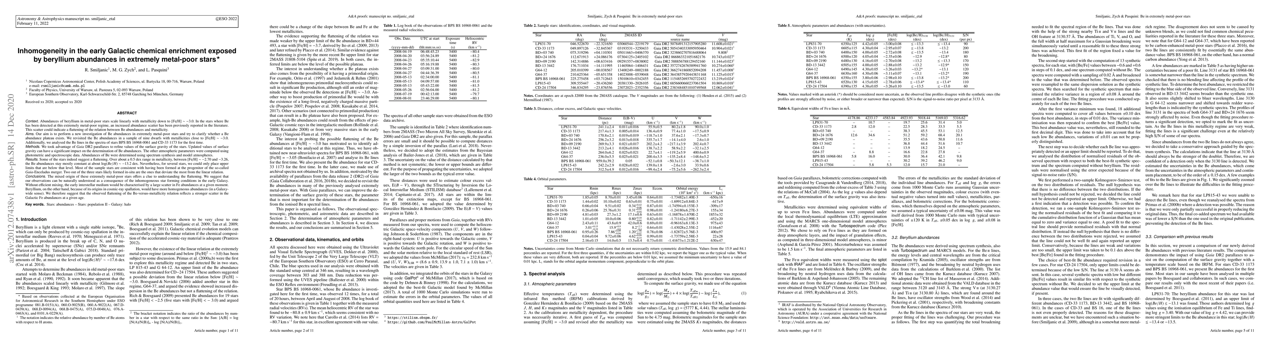 This study investigates beryllium abundances in extremely metal-poor stars, revealing a constant Be abundance between [Fe/H] ~ -2.70 and -3.26, suggesting inhomogeneity in early Galactic chemical enrichment. The findings imply varied Fe abundances at a given age, contrasting with more homogeneous Be abundances originating from cosmic-ray spallation.