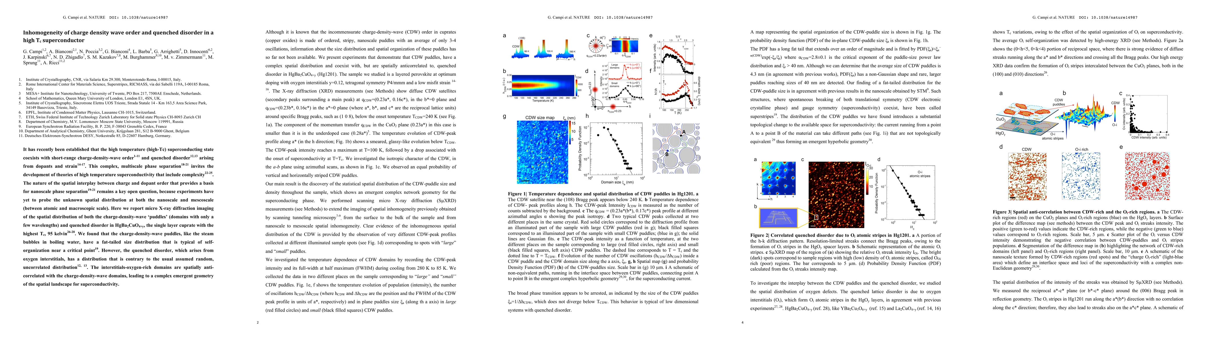 It has recently been established that the high temperature (high-Tc) superconducting state coexists with short-range charge-density-wave order and quenched disorder arising from dopants and strain. This complex, multiscale phase separation invites the development of theories of high temperature superconductivity that include complexity. The nature of the spatial interplay between charge and dopant order that provides a basis for nanoscale phase separation remains a key open question, because experiments have yet to probe the unknown spatial distribution at both the nanoscale and mescoscale (between atomic and macroscopic scale). Here we report micro X-ray diffraction imaging of the spatial distribution of both the charge-density-wave puddles (domains with only a few wavelengths) and quenched disorder in HgBa2CuO4+y, the single layer cuprate with the highest Tc, 95 kelvin. We found that the charge-density-wave puddles, like the steam bubbles in boiling water, have a fat-tailed size distribution that is typical of self-organization near a critical point. However, the quenched disorder, which arises from oxygen interstitials, has a distribution that is contrary to the usual assumed random, uncorrelated distribution. The interstitials-oxygen-rich domains are spatially anti-correlated with the charge-density-wave domains, leading to a complex emergent geometry of the spatial landscape for superconductivity.