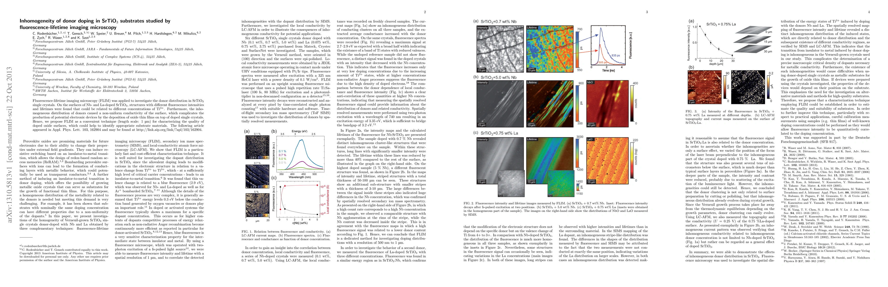 Fluorescence-lifetime imaging microscopy (FLIM) was applied to investigate the donor distribution in SrTiO3 single crystals. On the surfaces of Nb- and La-doped SrTiO3, structures with different fluorescence intensities and lifetimes were found that could be related to different concentrations of Ti3+. Furthermore, the inhomogeneous distribution of donors caused a non-uniform conductivity of the surface, which complicates the production of potential electronic devices by the deposition of oxide thin films on top of doped single crystals. Hence, we propose FLIM as a convenient technique (length scale: 1 $\mu$m) for characterizing the quality of doped oxide surfaces, which could help to identify appropriate substrate materials.