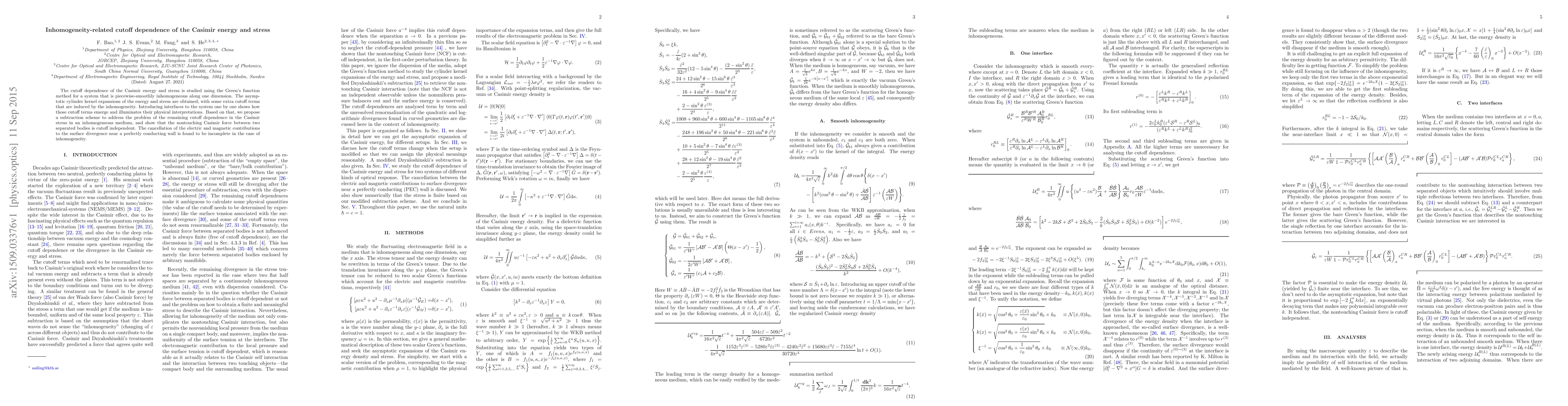 This paper investigates the cutoff dependence of Casimir energy and stress in piecewise-smoothly inhomogeneous systems using Green's function methods. It proposes a subtraction scheme to mitigate remaining cutoff dependence in Casimir stress, demonstrating cutoff-independent nontouching Casimir forces between separated bodies.