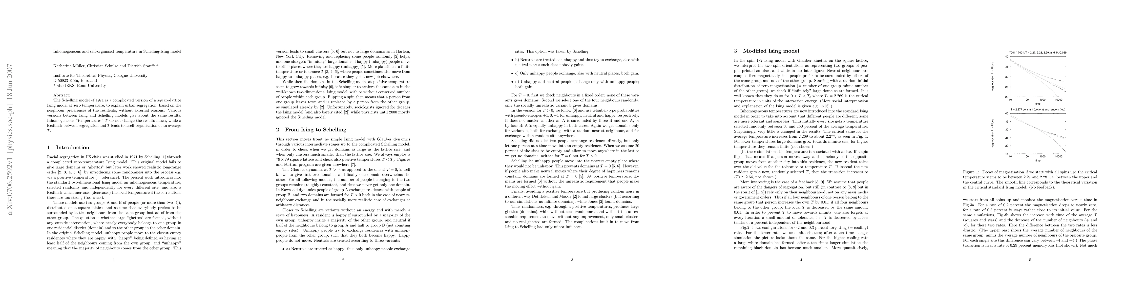 The Schelling model of 1971 is a complicated version of a square-lattice Ising model at zero temperature, to explain urban segregation, based on the neighbour preferences of the residents, without external reasons. Various versions between Ising and Schelling models give about the same results. Inhomogeneous "temperatures" T do not change the results much, while a feedback between segregation and T leads to a self-organisation of an average T.