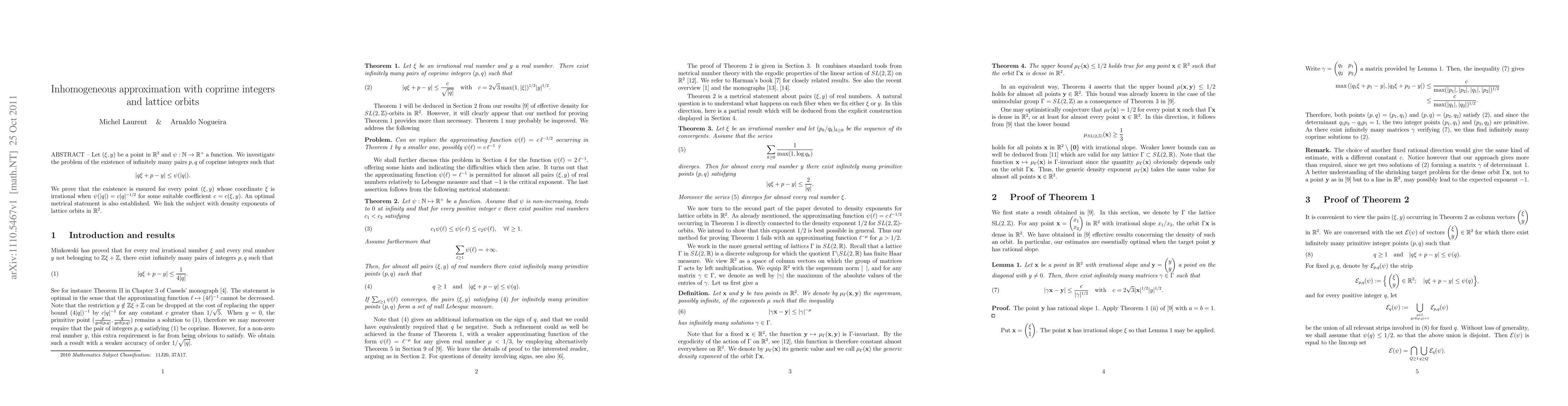 Researchers extend the Minkowski Theorem to inhomogeneous approximation with coprime integer solutions, linking it to density exponents of lattice orbits in the real plane.