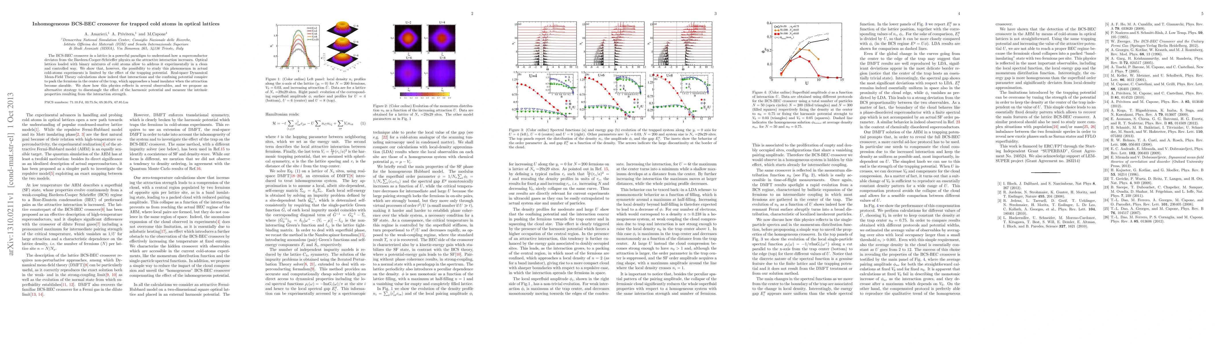 This paper explores the BCS-BEC crossover in optical lattices with trapped cold atoms, revealing that the confining potential limits experimental observation. Real-space Dynamical Mean-Field Theory calculations demonstrate that the trap's potential and interactions drive fermions towards the center, forming a band insulator with strong attraction, and proposes an alternative method to isolate intrinsic interaction properties.